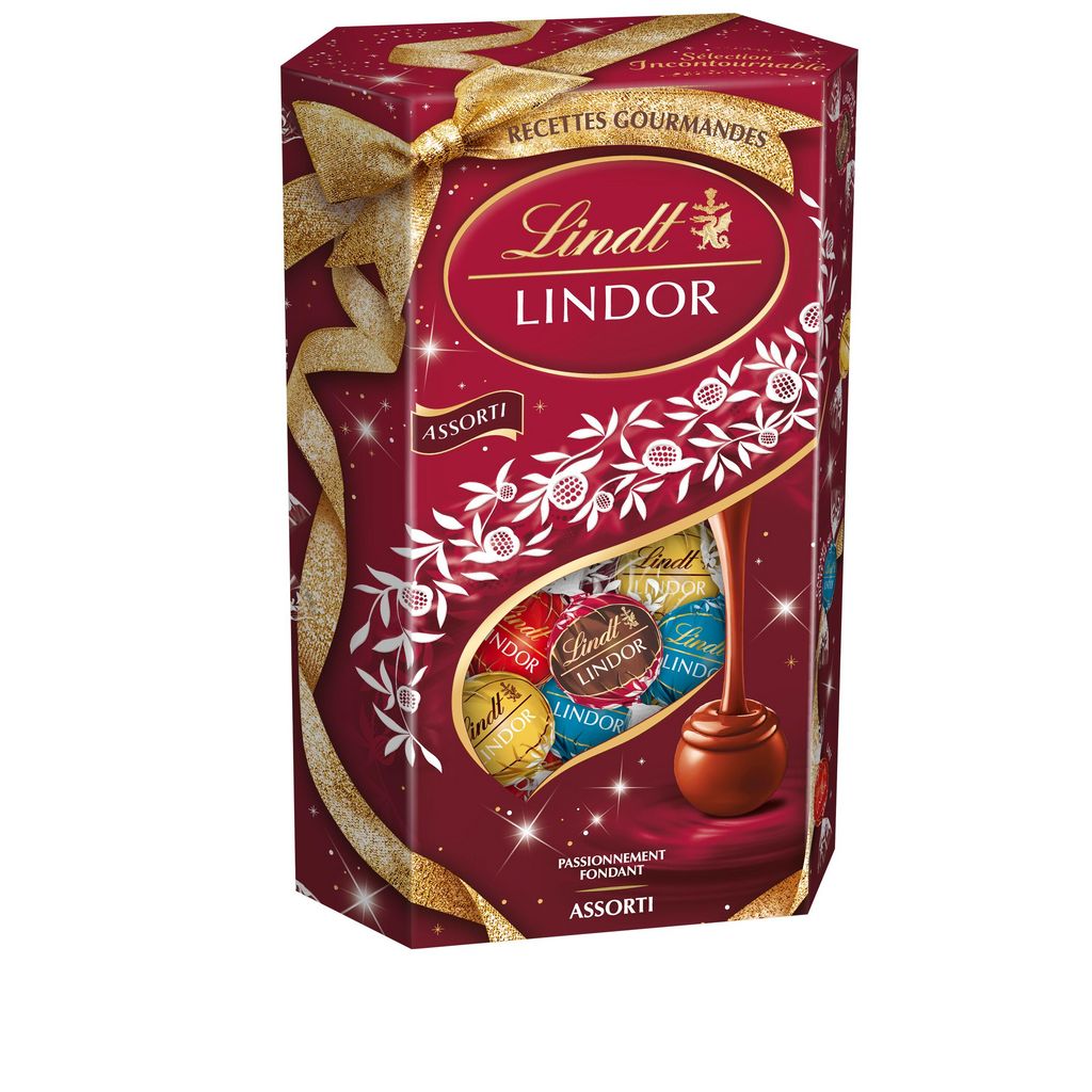 Pour les fêtes de Noël, craquez pour LINDOR Assorti 562g. Un assortiment de quatre recettesi gourmandes LINDOR: Lait, Blanc, Double Chocolat et Caramel Pointe de Sel. Le format idéal à partager ou à offrir! Croquez sa délicate coquille, et découvrez son cœur irrésistiblement fondant, pour un moment de pur bonheur. Fondez de bonheur avec LINDOR, créé par les Maîtres Chocolatiers Lindt.