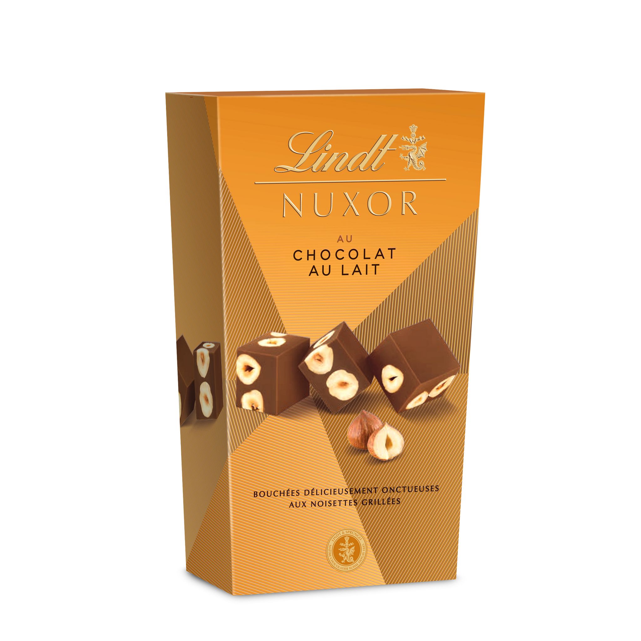NUXOR Lait, c'est une parfaite combinaison de textures grâce à des ingrédients de haute qualité : l'onctuosité d'un gianduja au chocolat au lait et le croquant des délicates noisettes grillées, soigneusement sélectionnés par les Maîtres Chocolatiers Lindt. Une forme cubique unique, emballée délicatement dans un élégant papier doré, pour offrir ou pour se faire plaisir !