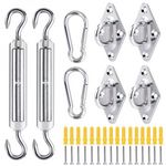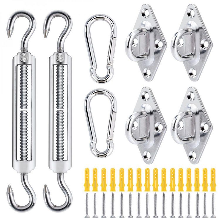 Ce kit de fixation pour voile d'ombrage Linxor est l'allié idéal pour fixer solidement votre voile d'ombrage. Ce kit se compose de 4 supports de fixations, 2 mousquetons, 2 tendeurs à crochets, 16 vis, et 16 chevilles en plastique PE pour béton. Le kit est fabriqué en acier inoxydable 304 de haute qualité et peut supporter jusqu'à 150 kilos. Spécialement conçu pour un usage extérieur, votre voile d'ombrage sera ainsi bien maintenue et résistera davantage aux intempéries. Qu'importe la forme de votre voile d'ombrage : carrée, rectangulaire ou triangulaire, ce kit de fixation s'adaptera à votre toile tendue permettant d'ombrager une terrasse, patio ou balcon. Chaque tendeur mesure de 14 cm à 21 cm, chaque mousqueton 6 cm, chaque support de fixation 6.5 cm de longueur et 3.8 cm de largeur, chaque vis 4.2 cm et chaque cheville 3 cm.