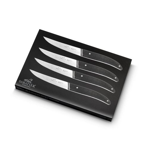 Lion Sabatier 901080 Coffret de 4 couteaux steak OCCITAN Lion Sabatier internationalLame acier 5Cr15MoV soit environ 0,50% de carbone pour la dureté, 15% de chrome pour l'inoxyable, du molybdène et du vanadium pour l'anticorrosionManche BoisLa lame des couteaux est lisse et mesure 11.5 cm - Coffret
