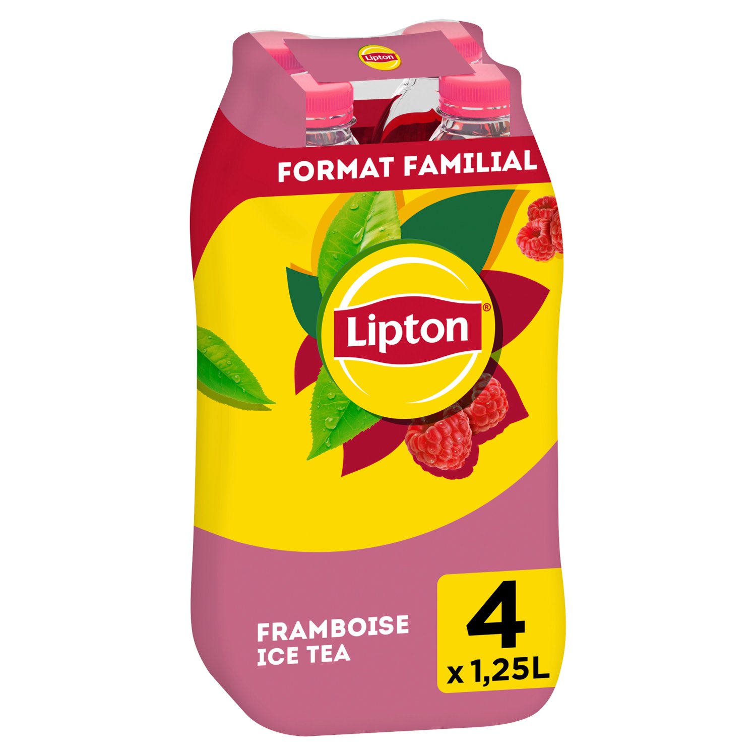 Boisson rafraîchissante aux extraits de thé goût framboise, avec sucres et édulcorant.