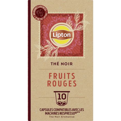 Le thé noir capsules Fruits Rouges de Lipton® évoque la gourmandise et les fruits d'été. Vivifiant, gourmand, savoureux par ses notes de framboises, de fraises et de cerises, ce thé savoureux est une gourmandise qui rappelle le bonbon. Ses notes acidulées, raviront les amateurs à la recherche d'un moment sucré, sans les inconvénients du sucre. Lipton® a utilisé son expertise pour créer une gamme de capsules de thés et d'infusions uniques et savoureuses compatibles avec votre machine Nespresso®*. Ce thé capsules vous permet de préparer votre boisson chaude de façon simple et rapide. Notre histoire : quand Sir Thomas Lipton fonda sa société à la fin du 19ème siècle, il acheta sa première plantation de thé à Ceylan (Sri Lanka). Plus de cent ans après, Lipton® possède des milliers d'hectares de théiers de qualité en Afrique orientale. Bâti sur une expérience de plus d'un siècle en matière de culture et de mélange de thé, Lipton® a conservé l'amour de Sir Thomas pour l'innovation et l'excellence. Lipton® s’appuie sur des valeurs solides inspirées par son fondateur Sir Thomas Lipton : naturalité, optimisme et dynamisme. Marque moderne et éloignée des codes traditionnels du « tea-time », Lipton® a fondé son succès sur le développement d’une « expérience de dégustation » dans laquelle la consommation pourra connaître des moments de plaisirs partagés, de découvertes et de convivialité. Plus de cent ans de réussites et d’innovations ont permis à Lipton d’apporter davantage de plaisir autour du thé à plus de personnes dans le monde. Dans cet esprit d’inventivité, de recherche et de découverte, Lipton® contribue à faire découvrir les bienfaits du thé infusé, noir ou vert. En tout, Lipton® comptabilise près de 80 références de thés et infusions en France. *Nespresso® est une marque de Société des produits Nestlé S.A., qui n’a aucun lien avec le groupe Unilever et les sociétés du groupe Unilever. Retrouvez la liste des machines compatibles sur notre site Internet. Thé noir aromatisé fruits rouges