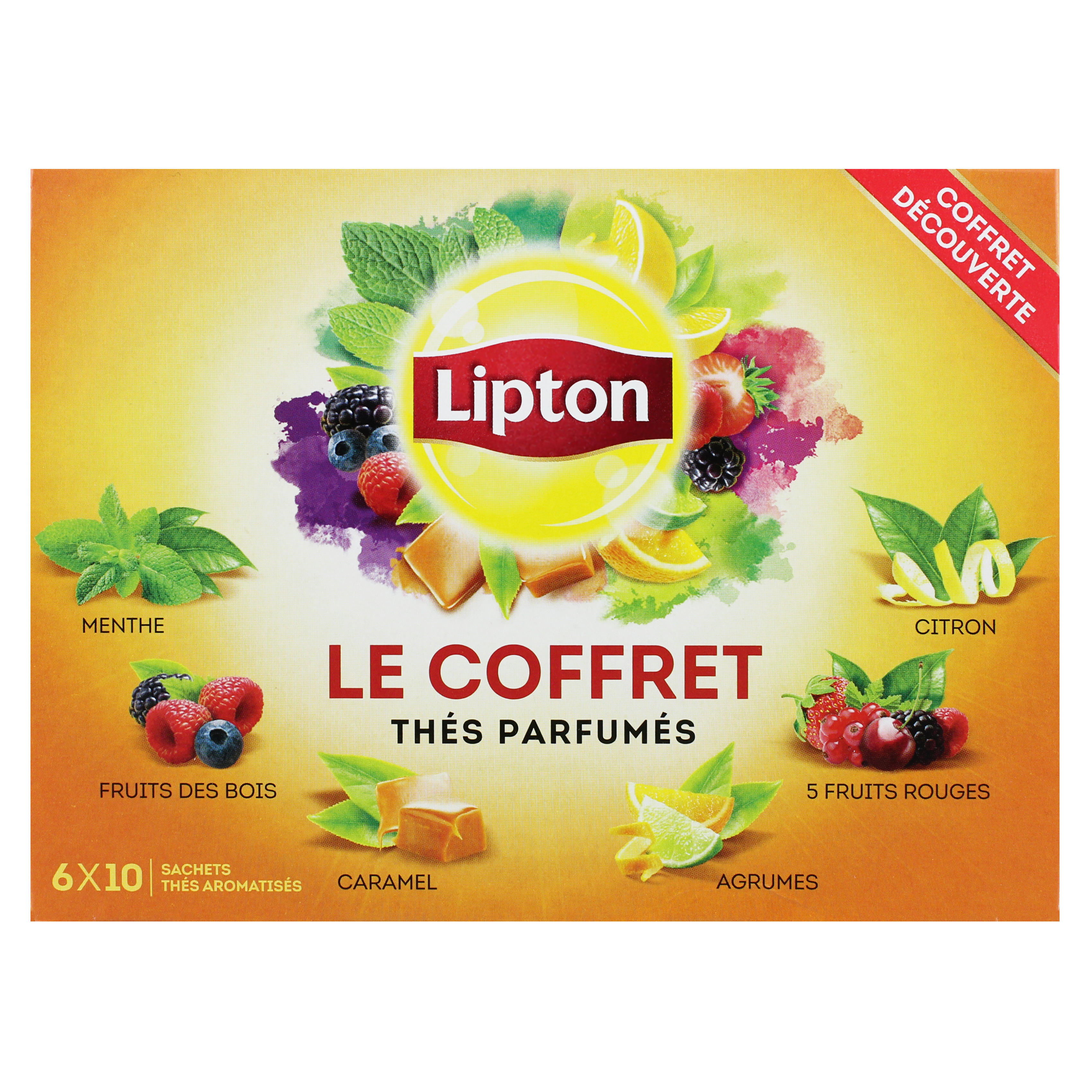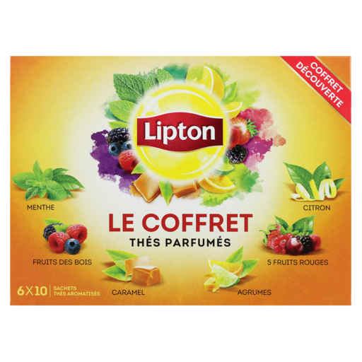 Thés aromatisés Le Coffret Thé Parfumés Lipton® contient 10 sachets de thé Fruits des Bois, 10 sachets de Thé Citron, 10 sachets de Thé Vert à la Menthe, 10 sachets de Thé aux Fruits Rouges, 10 sachets de Thé Caramel et 10 sachets de Thé Agrumes. Une offre variée en une seule boîte pour découvrir de nouvelles saveurs. Les sachets enveloppés du coffret sont hermétiques pour une meilleure hygiène et conservation des arômes. Découvrez notre coffret thés parfumés pour combler votre entourage. Lipton® est engagé dans la filière du développement durable avec sa certification Rainforest Alliance. La totalité du thé Lipton® provient de plantations certifiées Rainforest Alliance pour un thé plus respectueux des cultivateurs et de l’environnement. Lipton® s'est engagé à soutenir les petits exploitants agricoles à travers sa politique durable. Notre histoire : quand Sir Thomas Lipton fonda sa société à la fin du 19ème siècle, il acheta sa première plantation de thé à Ceylan (Sri Lanka). Plus de cent ans après,Lipton® possède des milliers d'hectares de théiers de qualité en Afrique orientale. Bâti sur une expérience de plus d'un siècle en matière de culture et de mélange de thé, Lipton® a conservé l'amour de Sir Thomas pour l'innovation et l'excellence. Lipton® s’appuie sur des valeurs solides inspirées par son fondateur Sir Thomas Lipton : naturalité, optimisme et dynamisme. Marque moderne et éloignée des codes traditionnels du « tea-time », Lipton® a fondé son succès sur le développement d’une « expérience de dégustation » dans laquelle la consommation pourra connaître des moments de plaisirs partagés, de découvertes et de convivialité. Plus de cent ans de réussites et d’innovations ont permis à Lipton® d’apporter davantage de plaisir autour du thé à plus de personnes dans le monde. Dans cet esprit d’inventivité, de recherche et de découverte, Lipton® contribue à faire découvrir les bienfaits du thé infusé, noir ou vert. En tout, Lipton® comptabilise près de 80 références de thés et infusions en France.