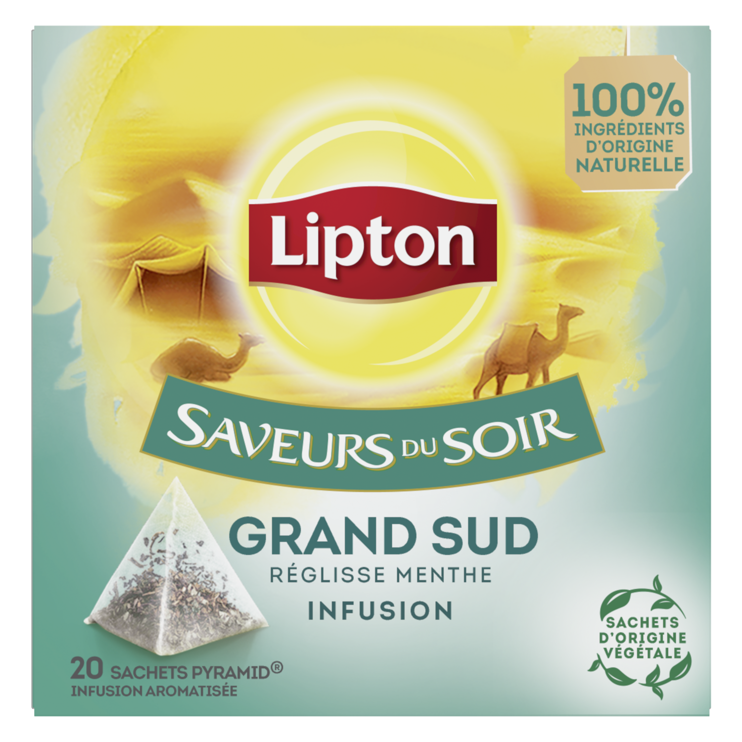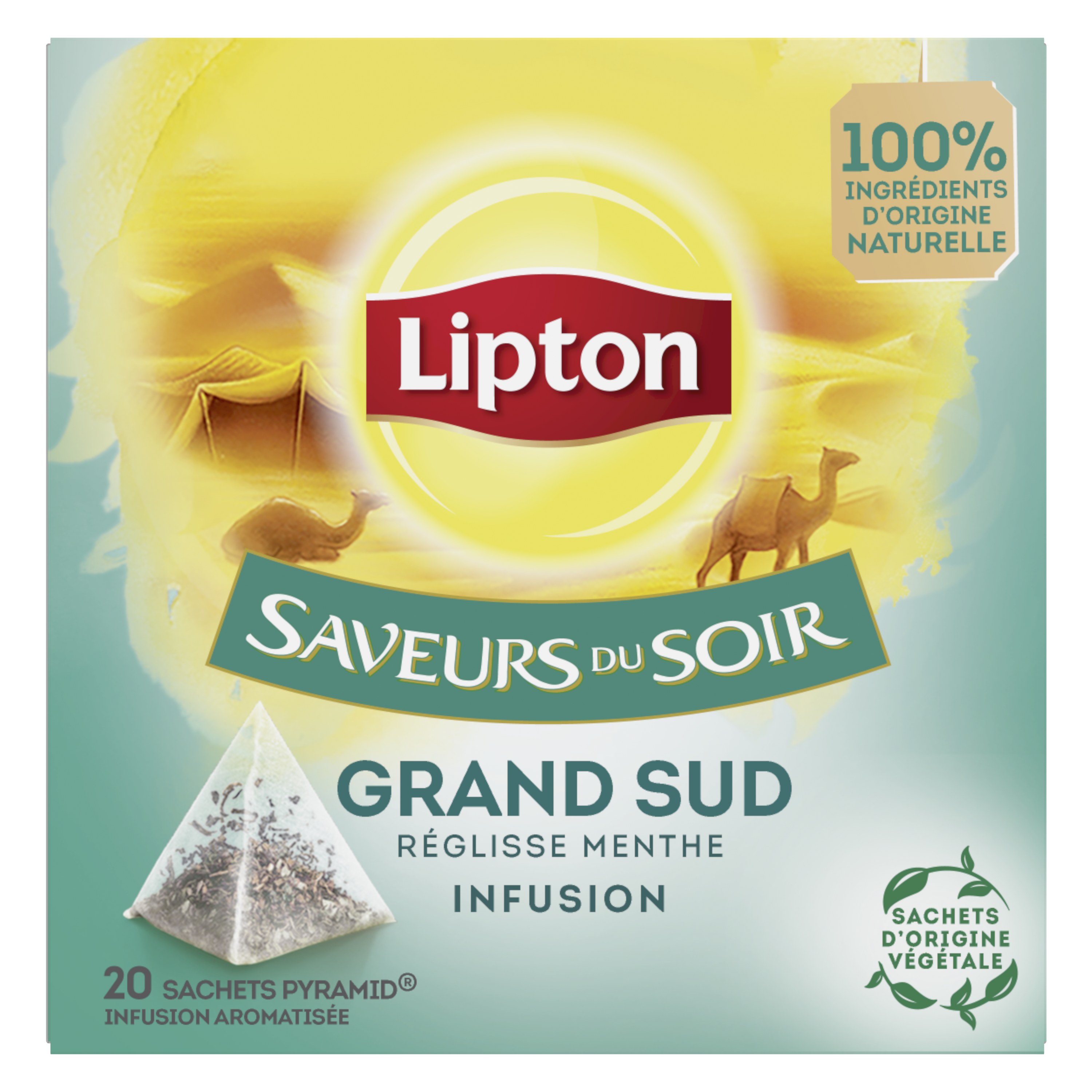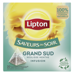 Laissez-vous emporter par le parfum enivrant des délicieuses infusions Saveurs du Soir Grand Sud de Lipton®. Cette infusion du soir offre une recette unique qui mêle les notes sucrées de la réglisse à la fraîcheur de la menthe, pour un goût naturellement délicieux. Les ingrédients de l'infusion Saveurs du Soir Infusion Grand Sud Menthe et Réglisse sont d'origine naturelle. Le sachet Pyramid® mis au point par Lipton® laisse tous les ingrédients exprimer généreusement leurs arômes naturels pour vous faire profiter de tous les plaisirs de votre infusion. Pour une dégustation parfaite, versez 200 ml d'eau à 100 °C, sans lait ni sucre et laissez infuser vos tisanes pendant 4 à 5 mn selon l'intensité désirée. Lipton® est engagé dans la filière du développement durable avec sa certification Rainforest Alliance. La totalité du thé Lipton® provient de plantations certifiées Rainforest Alliance pour un thé plus respectueux des cultivateurs et de l’environnement. Lipton® s'est engagé à soutenir les petits exploitants agricoles à travers sa politique durable. Notre histoire : Quand Sir Thomas Lipton fonda sa société à la fin du 19ᵉ siècle, il acheta sa première plantation de thé à Ceylan (Sri Lanka). Plus de cent ans après, Lipton possède des milliers d'hectares de théiers de qualité en Afrique orientale. Bâti sur une expérience de plus d'un siècle en matière de culture et de mélange de thé, Lipton a conservé l'amour de Sir Thomas pour l'innovation et l'excellence. Lipton s’appuie sur des valeurs solides inspirées par son fondateur : naturalité, optimisme et dynamisme. Dans cet esprit d’inventivité, de recherche et de découverte, Lipton contribue à faire découvrir les bienfaits du thé infusé, noir ou vert. Marque moderne et éloignée des codes traditionnels du « tea-time », Lipton a fondé son succès sur le développement d’une « expérience de dégustation » basée sur des moments de plaisirs partagés, de découvertes et de convivialité. La totalité du thé Lipton provient de plantations vérifiées Rainforest Alliance pour un thé plus respectueux des cultivateurs et de l’environnement. Vous pouvez également explorer la gamme « Bien-Être » de Lipton®, spécialement conçue pour les moments où vous avez envie de prendre soin de vous.