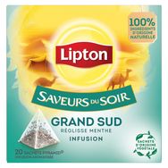 Laissez-vous emporter par le parfum enivrant des délicieuses infusions Saveurs du Soir Grand Sud de Lipton®. Cette infusion du soir offre une recette unique qui mêle les notes sucrées de la réglisse à la fraîcheur de la menthe, pour un goût naturellement délicieux. Les ingrédients de l'infusion Saveurs du Soir Infusion Grand Sud Menthe et Réglisse sont d'origine naturelle. Le sachet Pyramid® mis au point par Lipton® laisse tous les ingrédients exprimer généreusement leurs arômes naturels pour vous faire profiter de tous les plaisirs de votre infusion. Pour une dégustation parfaite, versez 200 ml d'eau à 100 °C, sans lait ni sucre et laissez infuser vos tisanes pendant 4 à 5 mn selon l'intensité désirée. Lipton® est engagé dans la filière du développement durable avec sa certification Rainforest Alliance. La totalité du thé Lipton® provient de plantations certifiées Rainforest Alliance pour un thé plus respectueux des cultivateurs et de l'environnement. Lipton® s'est engagé à soutenir les petits exploitants agricoles à travers sa politique durable. Notre histoire : Quand Sir Thomas Lipton fonda sa société à la fin du 19ᵉ siècle, il acheta sa première plantation de thé à Ceylan (Sri Lanka). Plus de cent ans après, Lipton possède des milliers d'hectares de théiers de qualité en Afrique orientale. Bâti sur une expérience de plus d'un siècle en matière de culture et de mélange de thé, Lipton a conservé l'amour de Sir Thomas pour l'innovation et l'excellence. Lipton s'appuie sur des valeurs solides inspirées par son fondateur : naturalité, optimisme et dynamisme. Dans cet esprit d'inventivité, de recherche et de découverte, Lipton contribue à faire découvrir les bienfaits du thé infusé, noir ou vert. Marque moderne et éloignée des codes traditionnels du « tea-time », Lipton a fondé son succès sur le développement d'une « expérience de dégustation » basée sur des moments de plaisirs partagés, de découvertes et de convivialité. La totalité du thé Lipton provient de plantations certifiées Rainforest Alliance pour un thé plus respectueux des cultivateurs et de l'environnement.