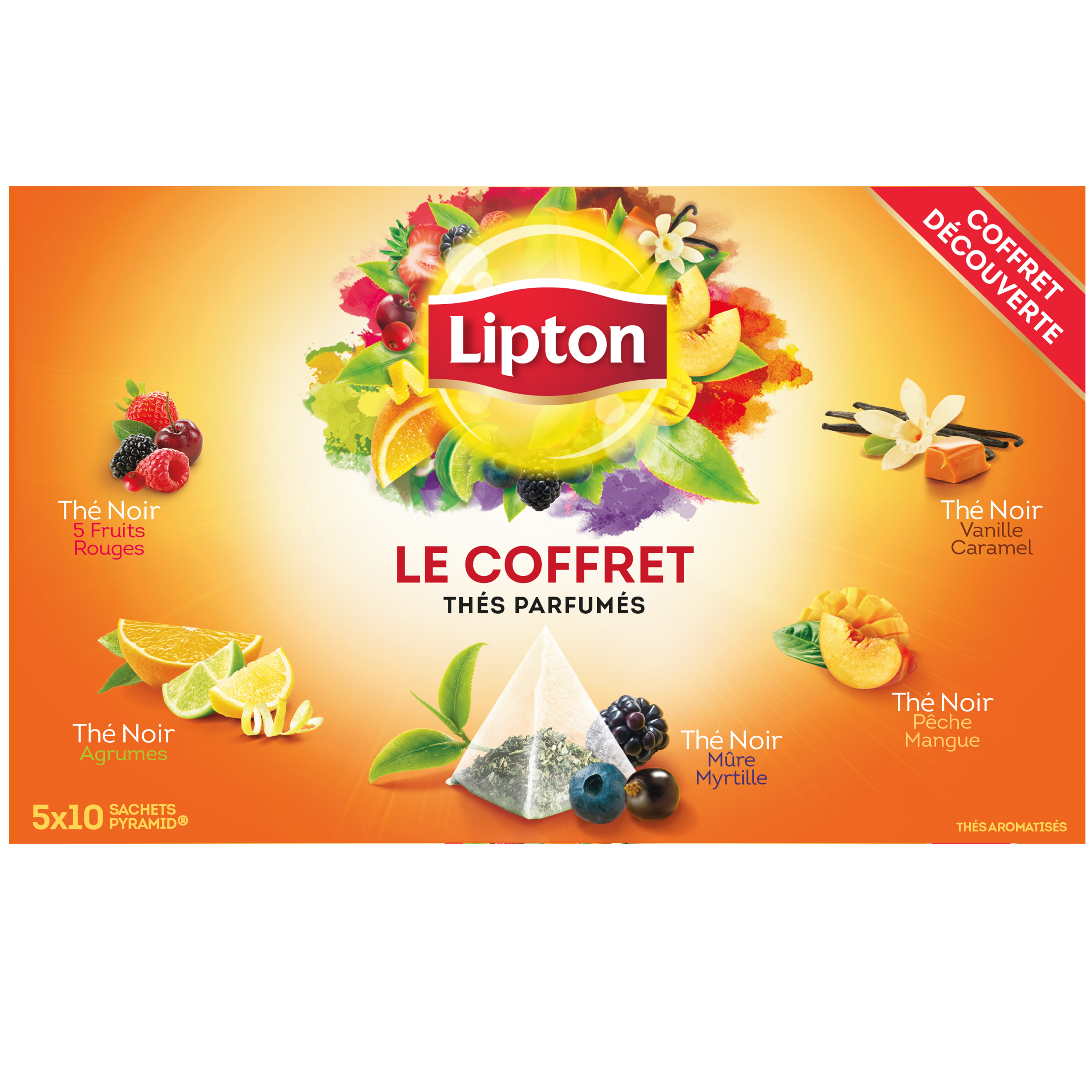 Redécouvrez les incontournables thés noirs Lipton dans ce coffret de 50 sachets composé de 5 recettes de thés noirs gourmands. Thé noir 5 Fruits Rouges Thé noir Agrumes Thé noir Mûre Myrtille Thé noir Pêche Mangue Thé noir Vanille Caramel Depuis 2003, Lipton propose le sachet Pyramid®, un sachet innovant qui propose plus d'espace pour les feuilles de thé et les fruits et permet une meilleure infusion pour un goût plus intense. Notre histoire : Quand Sir Thomas Lipton fonda sa société à la fin du 19ème siècle, il acheta sa première plantation de thé à Ceylan (Sri Lanka). Plus de cent ans après, Lipton possède des milliers d'hectares de théiers de qualité en Afrique orientale. Bâti sur une expérience de plus d'un siècle en matière de culture et de mélange de thé, Lipton a conservé l'amour de Sir Thomas pour l'innovation et l'excellence. Lipton s’appuie sur des valeurs solides inspirées par son fondateur Sir Thomas Lipton: naturalité, optimisme et dynamisme. Marque moderne et éloignée des codes traditionnels du « tea-time », Lipton a fondé son succès sur le développement d’une « expérience de dégustation » dans laquelle la consommation pourra connaître des moments de plaisirs partagés, de découvertes et de convivialité. Plus de cent ans de réussites et d’innovations ont permis à Lipton d’apporter davantage de plaisir autour du thé à plus de personnes dans le monde. Dans cet esprit d’inventivité, de recherche et de découverte, Lipton contribue à faire découvrir les bienfaits du thé infusé, noir ou vert. En tout, Lipton comptabilise près de 80 références de thés et infusions en France. Thé Noir