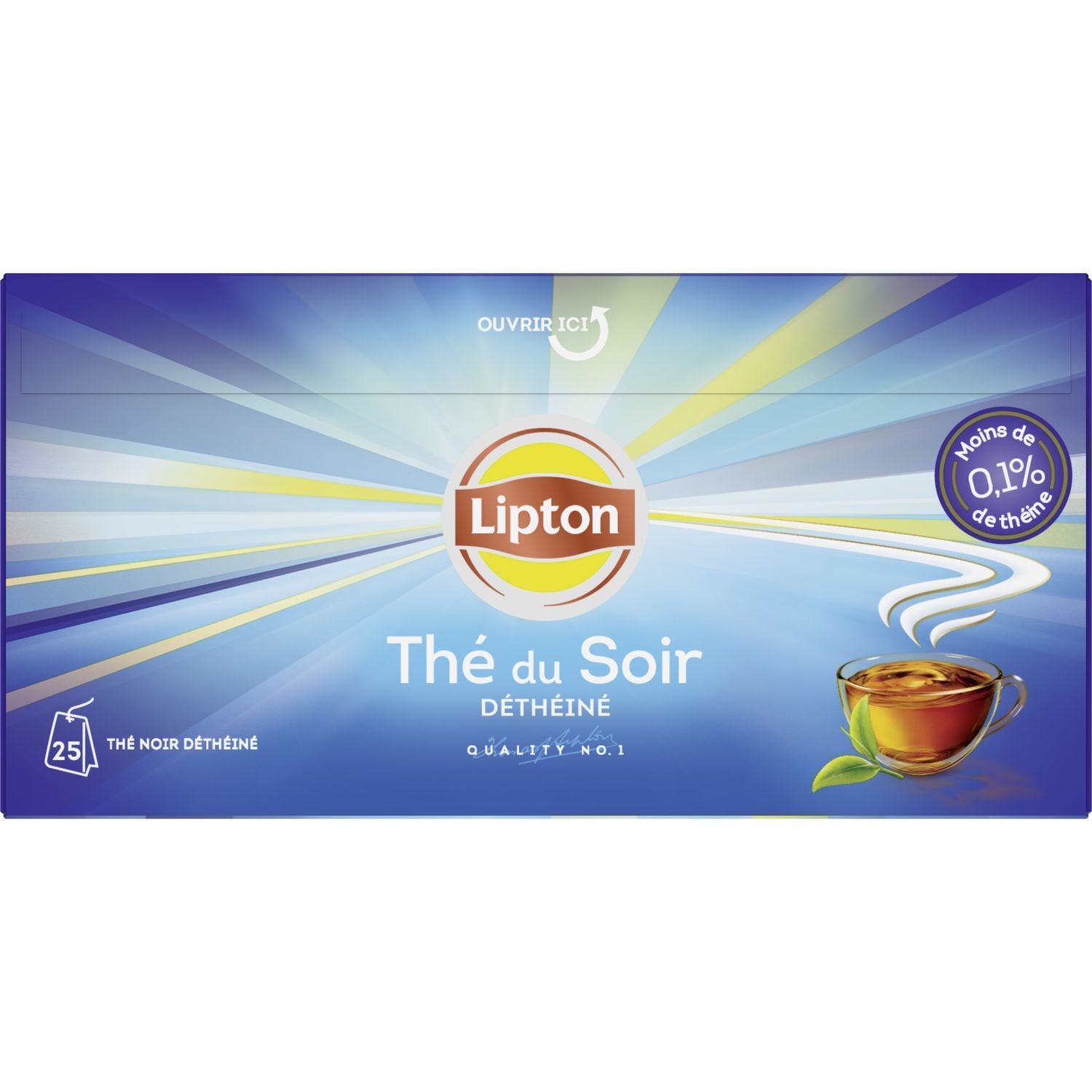 Lipton Thé du Soir conserve toute la saveur de feuilles de thé de grande qualité, sélectionnées par les experts Lipton pour leur goût frais, raffiné et aromatique. Cette sélection de thé a été délicatement déthéinée tout en conservant toutes ses précieuses qualités gustatives, pour un goût unique. Versez 200mL d'eau à 100C° et laisser infuser pendant 2-3 minutes. Ce thé convient aux personnes souhaitant éviter les boissons avec caféine. Notre histoire : Quand Sir Thomas Lipton fonda sa société à la fin du 19ème siècle, il acheta sa première plantation de thé à Ceylan (Sri Lanka). Plus de cent ans après, Lipton possède des milliers d'hectares de théiers de qualité en Afrique orientale. Bâti sur une expérience de plus d'un siècle en matière de culture et de mélange de thé, Lipton a conservé l'amour de Sir Thomas pour l'innovation et l'excellence. Lipton s’appuie sur des valeurs solides inspirées par son fondateur Sir Thomas Lipton: naturalité, optimisme et dynamisme. Marque moderne et éloignée des codes traditionnels du « tea-time », Lipton a fondé son succès sur le développement d’une « expérience de dégustation » dans laquelle la consommation pourra connaître des moments de plaisirs partagés, de découvertes et de convivialité. Plus de cent ans de réussites et d’innovations ont permis à Lipton d’apporter davantage de plaisir autour du thé à plus de personnes dans le monde. Dans cet esprit d’inventivité, de recherche et de découverte, Lipton contribue à faire découvrir les bienfaits du thé infusé, noir ou vert. En tout, Lipton comptabilise près de 80 références de thés et infusions en France. La totalité du thé Lipton provient de plantations vérifiées Rainforest Alliance pour un thé plus respectueux des cultivateurs et de l’environnement. Lipton s'est engagé à soutenir les petits exploitants agricoles à travers leur politique durable. Thé noir déthéiné