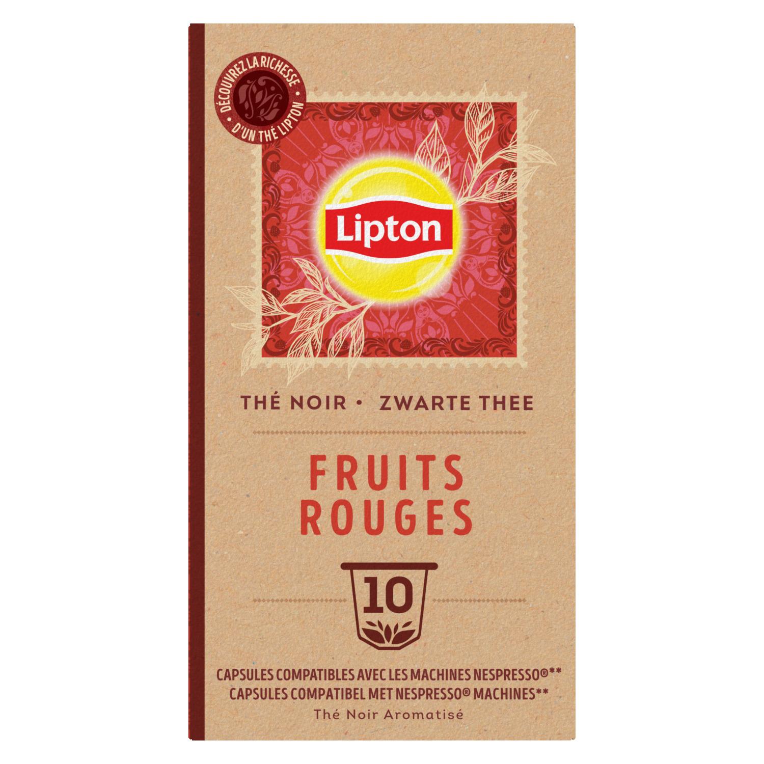 Le thé noir Fruits Rouges de Lipton® 10 capsules évoque la gourmandise et les fruits d'été. Par ses notes de framboises, de fraises et de cerises, ce thé savoureux est une gourmandise qui rappelle le bonbon. Ses notes acidulées raviront les amateurs à la recherche d'un moment sucré, sans les inconvénients du sucre. Lipton® a utilisé son expertise pour créer une gamme de capsules de thés (thé vert et thé noir) et d'infusions uniques et savoureuses compatibles avec votre machine Nespresso®*. Ces capsules de thé vous permettent de préparer votre boisson chaude de façon simple et rapide. Certifié PEFC, le carton de cette boîte est issu de forêts gérées durablement et de sources contrôlées. Lipton® est engagé dans la filière du développement durable avec sa certification Rainforest Alliance. La totalité du thé Lipton® provient de plantations certifiées Rainforest Alliance pour un thé plus respectueux des cultivateurs et de l'environnement. Lipton® s'est engagé à soutenir les petits exploitants agricoles à travers sa politique durable. Notre histoire : Quand Sir Thomas Lipton fonda sa société à la fin du 19ᵉ siècle, il acheta sa première plantation de thé à Ceylan (Sri Lanka). Plus de cent ans après, Lipton possède des milliers d'hectares de théiers de qualité en Afrique orientale. Bâti sur une expérience de plus d'un siècle en matière de culture et de mélange de thé, Lipton a conservé l'amour de Sir Thomas pour l'innovation et l'excellence. Lipton s'appuie sur des valeurs solides inspirées par son fondateur : naturalité, optimisme et dynamisme. Dans cet esprit d'inventivité, de recherche et de découverte, Lipton contribue à faire découvrir les bienfaits du thé infusé, noir ou vert. Marque moderne et éloignée des codes traditionnels du « tea-time », Lipton a fondé son succès sur le développement d'une « expérience de dégustation » basée sur des moments de plaisirs partagés, de découvertes et de convivialité. La totalité du thé Lipton provient de plantations certifiées Rainforest Alliance pour un thé plus respectueux des cultivateurs et de l'environnement. *Nespresso® est une marque de Société des produits Nestlé S. A., qui n'a aucun lien avec le groupe Lipton Teas and Infusions. Retrouvez la liste des machines compatibles sur notre site Internet.