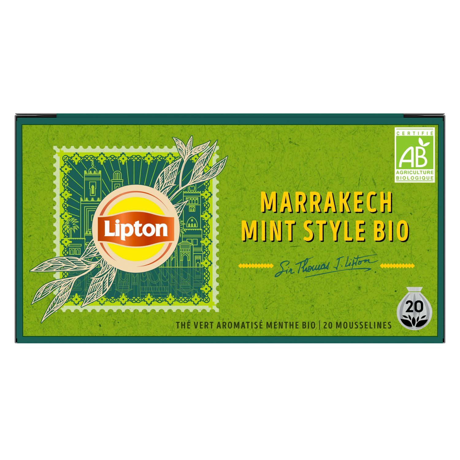 Les 20 sachets de Thé Vert Bio Marrakech Mint Lipton® vous accompagnent pour une pause rafraîchissant et délicatement parfumée.