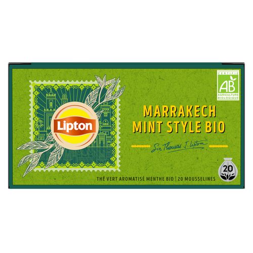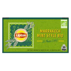 Fidèle à la tradition marocaine, le Thé Vert Bio Marrakech Mint Lipton® associe un thé vert biologique d'exception à de la menthe fraîche et délicate. Tout le savoir-faire de Sir Thomas Lipton dans 20 sachets de thé vert aromatisés à la menthe, pour un goût authentique et frais. Les ingrédients biologiques et d'origine naturelle de ce thé vert menthe ont été sélectionnés avec soin pour apporter un goût authentique et un parfum qui fait que chaque gorgée un voyage. Les feuilles de thé présentes dans cette boîte ont été cueillies dans les plantations certifiées Rainforest Alliance et sélectionnées avec attention pour vous offrir du thé de grande qualité. Elles ont ensuite été soigneusement emballées dans des sachets mousseline pour s'épanouir librement et libérer toutes leurs saveurs. Les ingrédients qui composent ce thé sont issus de l'agriculture biologique. Pour une dégustation parfaite, laissez infuser le thé vert 2 mn dans 200 ml d'eau à 90?°C. Lipton® est engagé dans la filière du développement durable avec sa certification Rainforest Alliance. La totalité du thé Lipton® provient de plantations certifiées Rainforest Alliance pour un thé plus respectueux des cultivateurs et de l'environnement. Lipton® s'est engagé à soutenir les petits exploitants agricoles à travers sa politique durable. Notre histoire : Quand Sir Thomas Lipton fonda sa société à la fin du 19? siècle, il acheta sa première plantation de thé à Ceylan (Sri Lanka). Plus de cent ans après, Lipton possède des milliers d'hectares de théiers de qualité en Afrique orientale. Bâti sur une expérience de plus d'un siècle en matière de culture et de mélange de thé, Lipton a conservé l'amour de Sir Thomas pour l'innovation et l'excellence. Lipton s'appuie sur des valeurs solides inspirées par son fondateur : naturalité, optimisme et dynamisme. Dans cet esprit d'inventivité, de recherche et de découverte, Lipton contribue à faire découvrir les bienfaits du thé infusé, noir ou vert. Marque moderne et éloignée des codes traditionnels du « tea-time », Lipton a fondé son succès sur le développement d'une « expérience de dégustation » basée sur des moments de plaisirs partagés, de découvertes et de convivialité. La totalité du thé Lipton provient de plantations vérifiées Rainforest Alliance pour un thé plus respectueux des cultivateurs et de l'environnement.