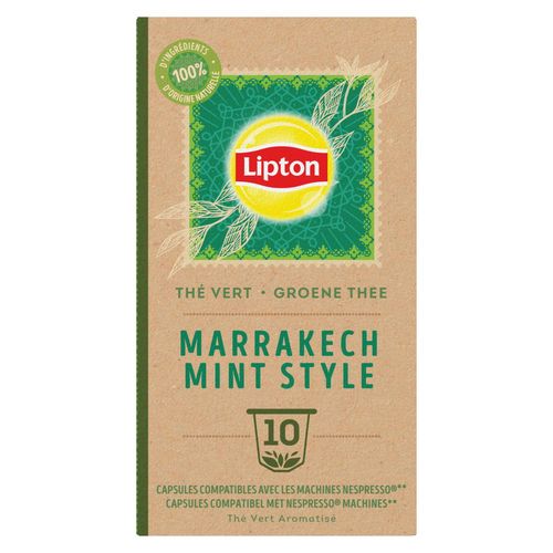 Profitez de tout le parfum et le goût d'un thé vert aromatisé dans un format capsule pratique grâce aux 10 capsules de Thé Vert Marrakech Mint Lipton®. Son goût innimitable de menthe vous transportera au coeur de la tradition marocaine. Laissez-vous tenter par la fraicheur et la puissance de la menthe pour un moment de gourmandise à la maison. Lipton® a utilisé son expertise pour créer une gamme de capsules de thés (thé noir et thé vert) et d'infusions uniques et savoureuses compatibles avec votre machine Nespresso®*. Ce thé en capsules vous permet de préparer votre boisson chaude de façon simple et rapide. Spécialiste du thé depuis 1893, Lipton®, c'est plus qu'un savoir faire, c'est une expérience exceptionnelle, une connaissance approfondie du thé. Lipton® est engagé dans la filière du développement durable avec sa certification Rainforest Alliance. Notre histoire : Quand Sir Thomas Lipton fonda sa société à la fin du 19ᵉ siècle, il acheta sa première plantation de thé à Ceylan (Sri Lanka). Plus de cent ans après, Lipton possède des milliers d'hectares de théiers de qualité en Afrique orientale. Bâti sur une expérience de plus d'un siècle en matière de culture et de mélange de thé, Lipton a conservé l'amour de Sir Thomas pour l'innovation et l'excellence. Lipton s'appuie sur des valeurs solides inspirées par son fondateur : naturalité, optimisme et dynamisme. Dans cet esprit d'inventivité, de recherche et de découverte, Lipton contribue à faire découvrir les bienfaits du thé infusé, noir ou vert. Marque moderne et éloignée des codes traditionnels du « tea-time », Lipton a fondé son succès sur le développement d'une « expérience de dégustation » basée sur des moments de plaisirs partagés, de découvertes et de convivialité. La totalité du thé Lipton provient de plantations certifiées Rainforest Alliance pour un thé plus respectueux des cultivateurs et de l'environnement. *Nespresso® est une marque de Société des produits Nestlé S. A., qui n'a aucun lien avec le groupe Lipton Teas and Infusions. Retrouvez la liste des machines compatibles sur notre site Internet.