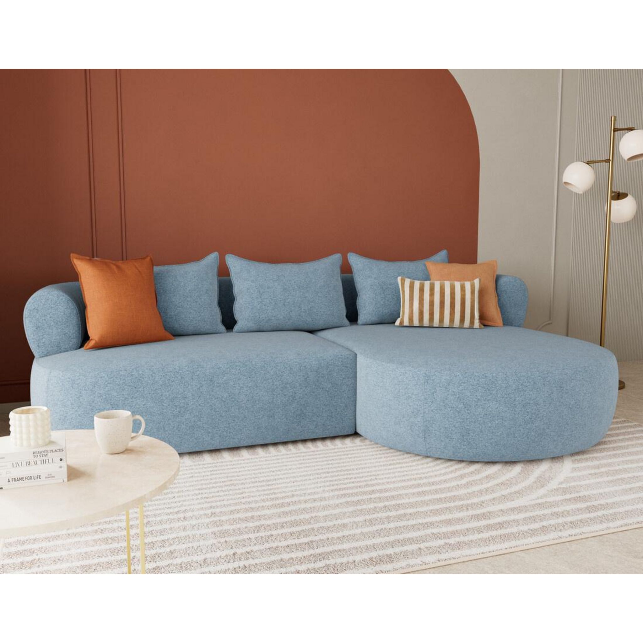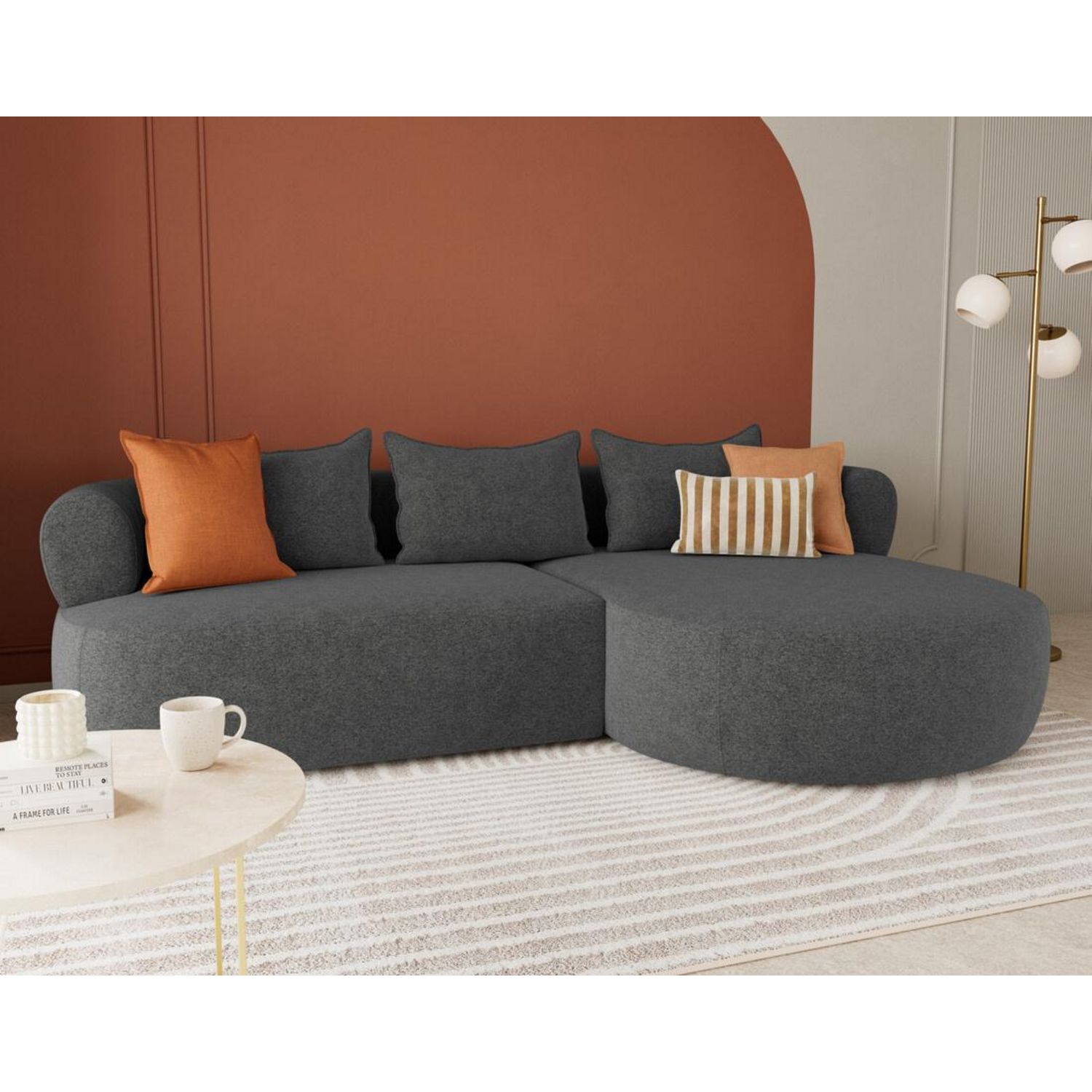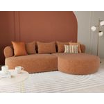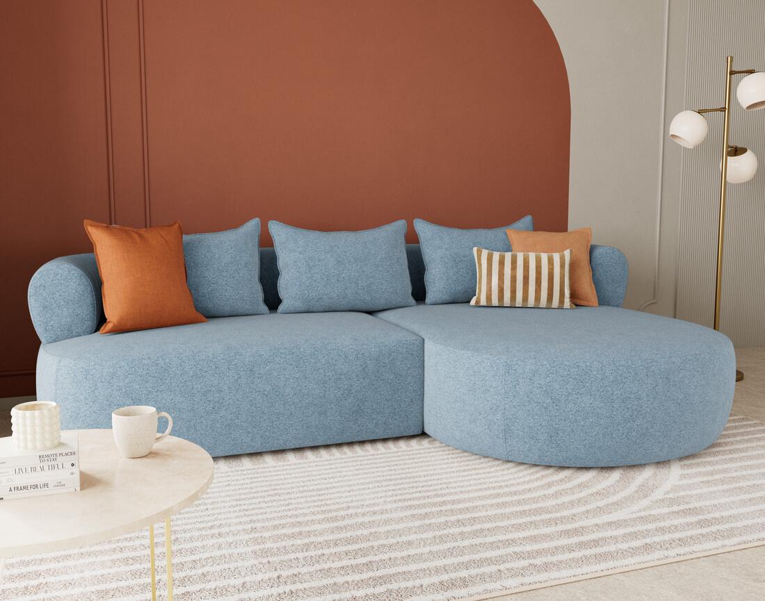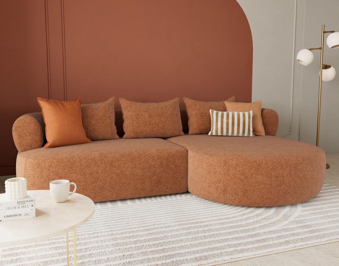 Le canapé d'angle droit Angela impose son style avec une silhouette élégante soulignée par des dossiers arrondis et une méridienne ultra tendance. Son design fluide et accueillant transforme votre salon en un espace cosy et chaleureux. Pensé pour le confort, il offre une belle largeur et une profondeur d'assise idéale pour s'installer longuement, que ce soit pour lire, discuter ou simplement se détendre.