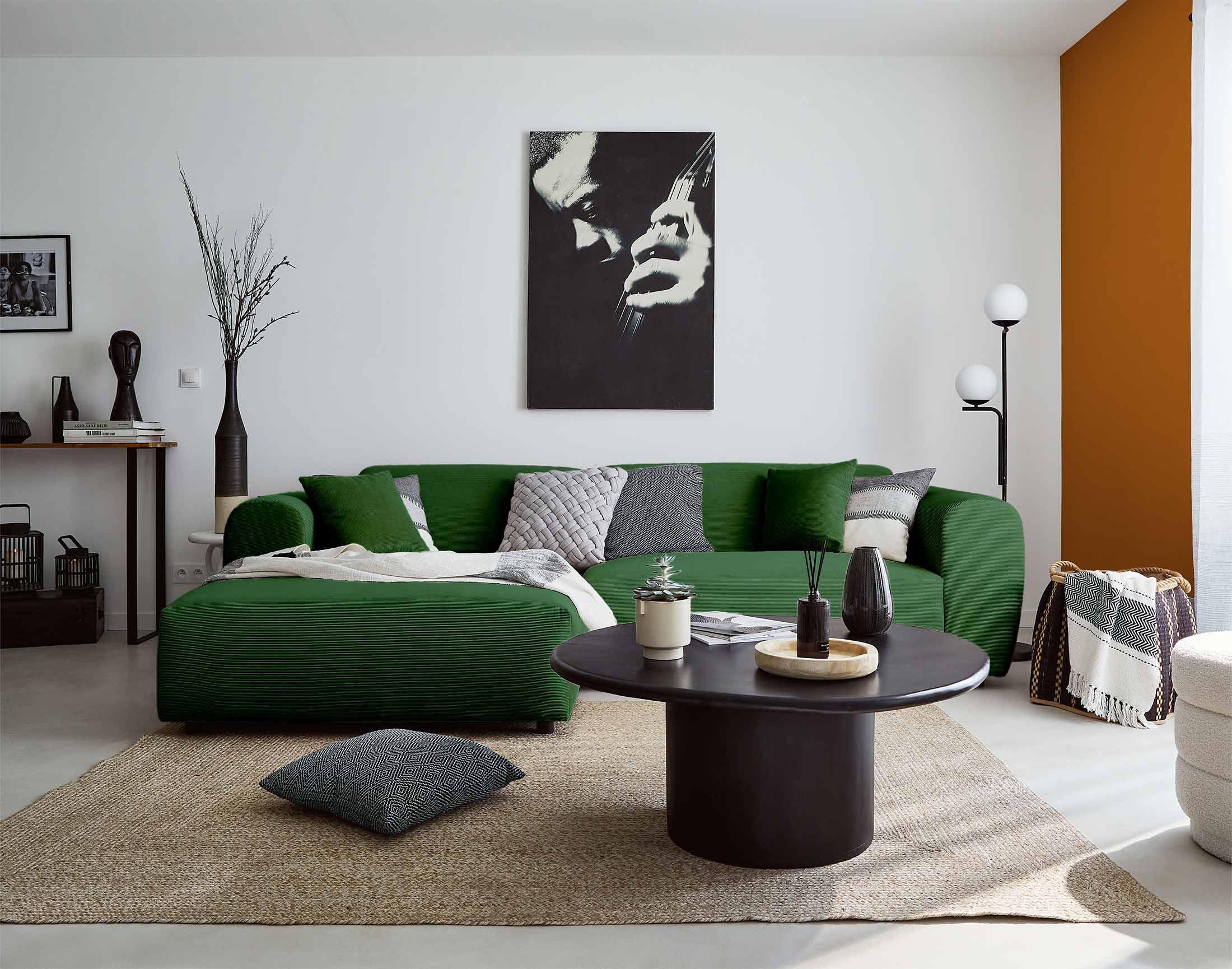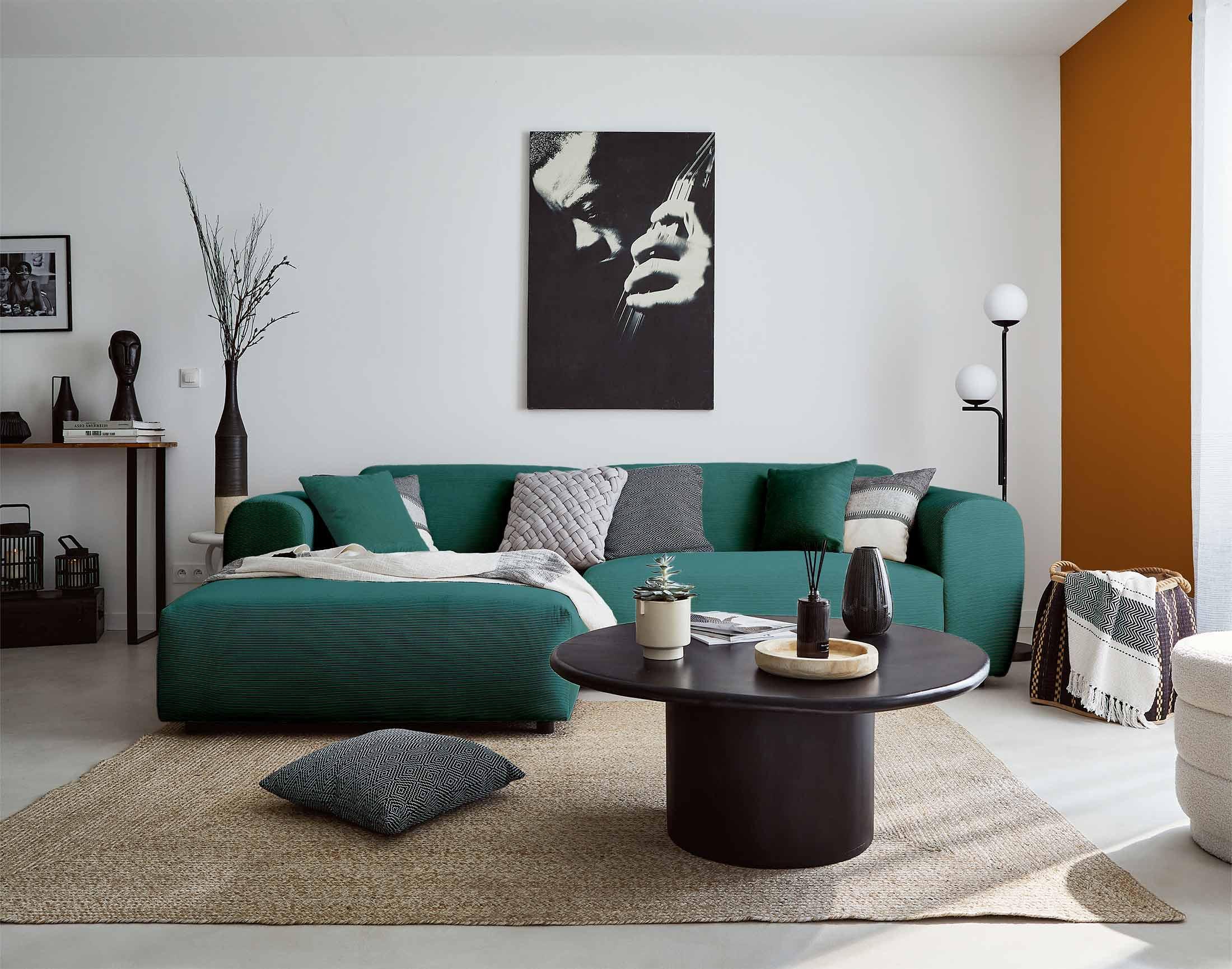 Profitez d'une pause moelleuse avec le canapé d'angle 4 places Aumance. Avec ses formes arrondies et ses lignes épurées, ce canapé deviendra la pièce maitresse de votre salon. Sa large méridienne et la douceur de son revêtement en velours côtelé vous séduiront à coup sûr !