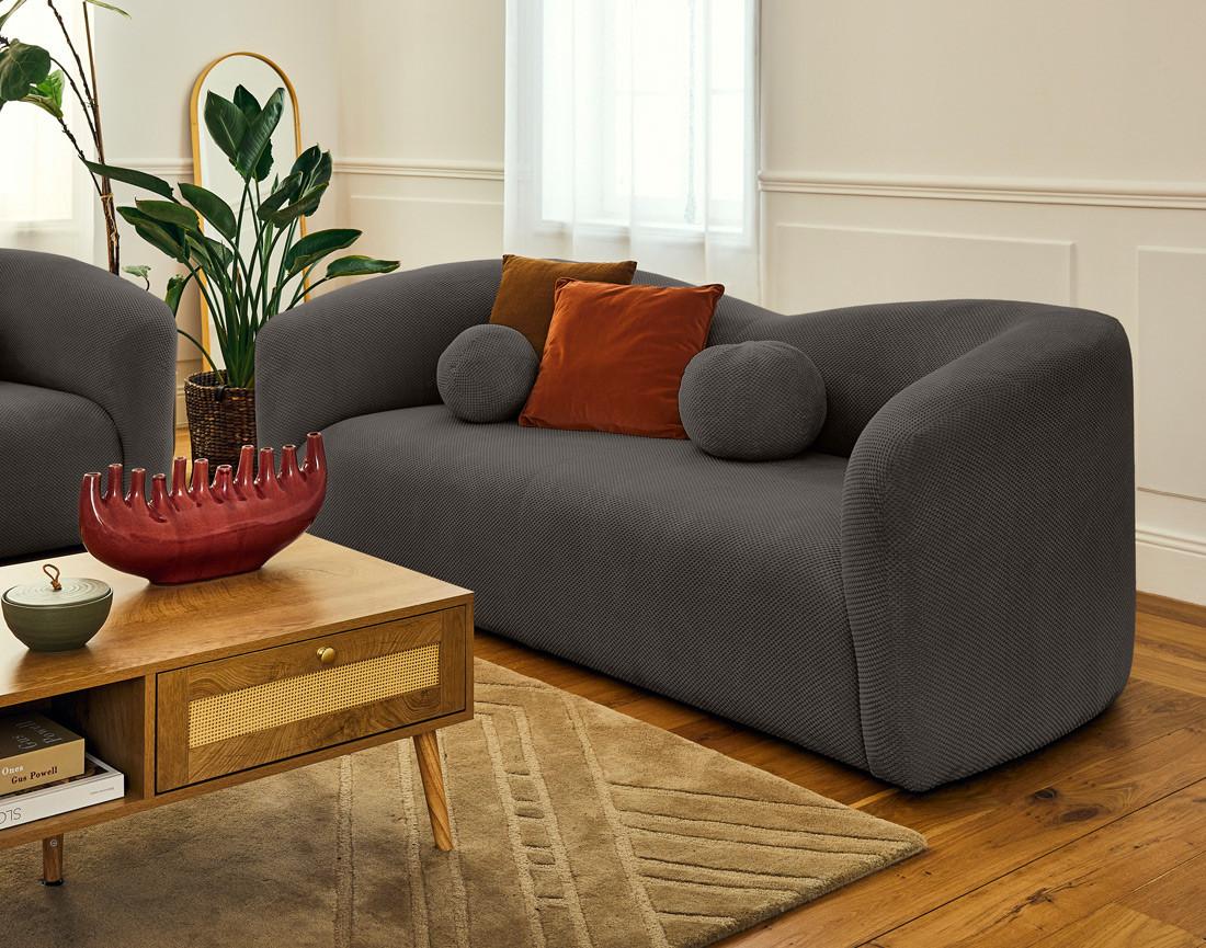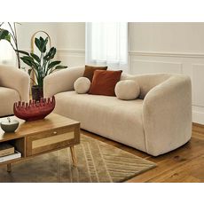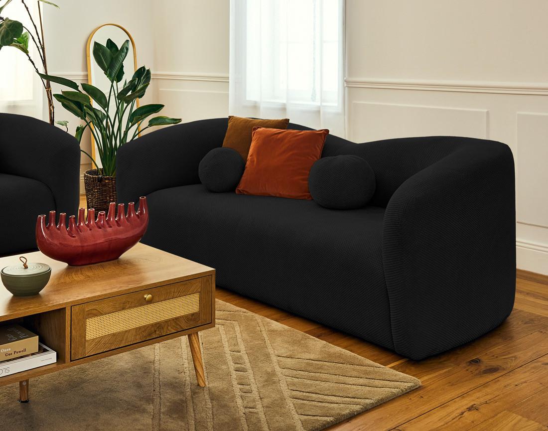 Le revêtement en velours texturé est associé à une structure robuste. La profondeur d'assise assurent une assise moelleuse et relaxante. Le dossier, garni de mousse, maintient parfaitement votre dos. Les suspensions ondulées ajoutent une souplesse certaine et garantissent un moment de relaxation intense. Les coussins décoratifs boules, fournis avec le canapé, complètent son look moderne. Ils ont une forme ludique qui ne manquera pas de plaire à vos invités.