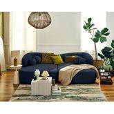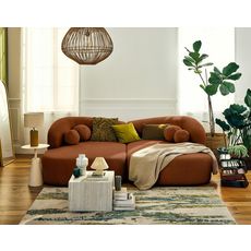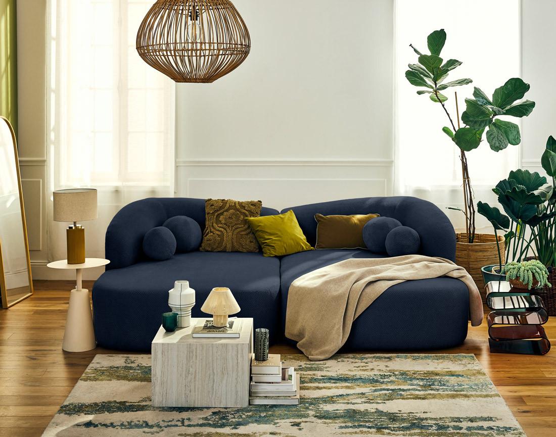 Sa double méridienne offre une disposition unique qui incite à jouer avec les formes. Avec une largeur et une profondeur généreuse, ce canapé est propice aux discussions à trois personnes ou à la relaxation en solo. Son revêtement est en velours texturé, très doux au toucher et très facile à entretenir au quotidien. Le canapé Charles se distingue aussi par sa grande profondeur d'assise. Les coussins décoratifs en forme de boules, inclus avec le meuble de salon, donnent une touche contemporaine. Avec une hauteur totale de 75 cm, le canapé Charles conserve une silhouette basse et élégante, tout ce qu'il faut pour les espaces contemporains.