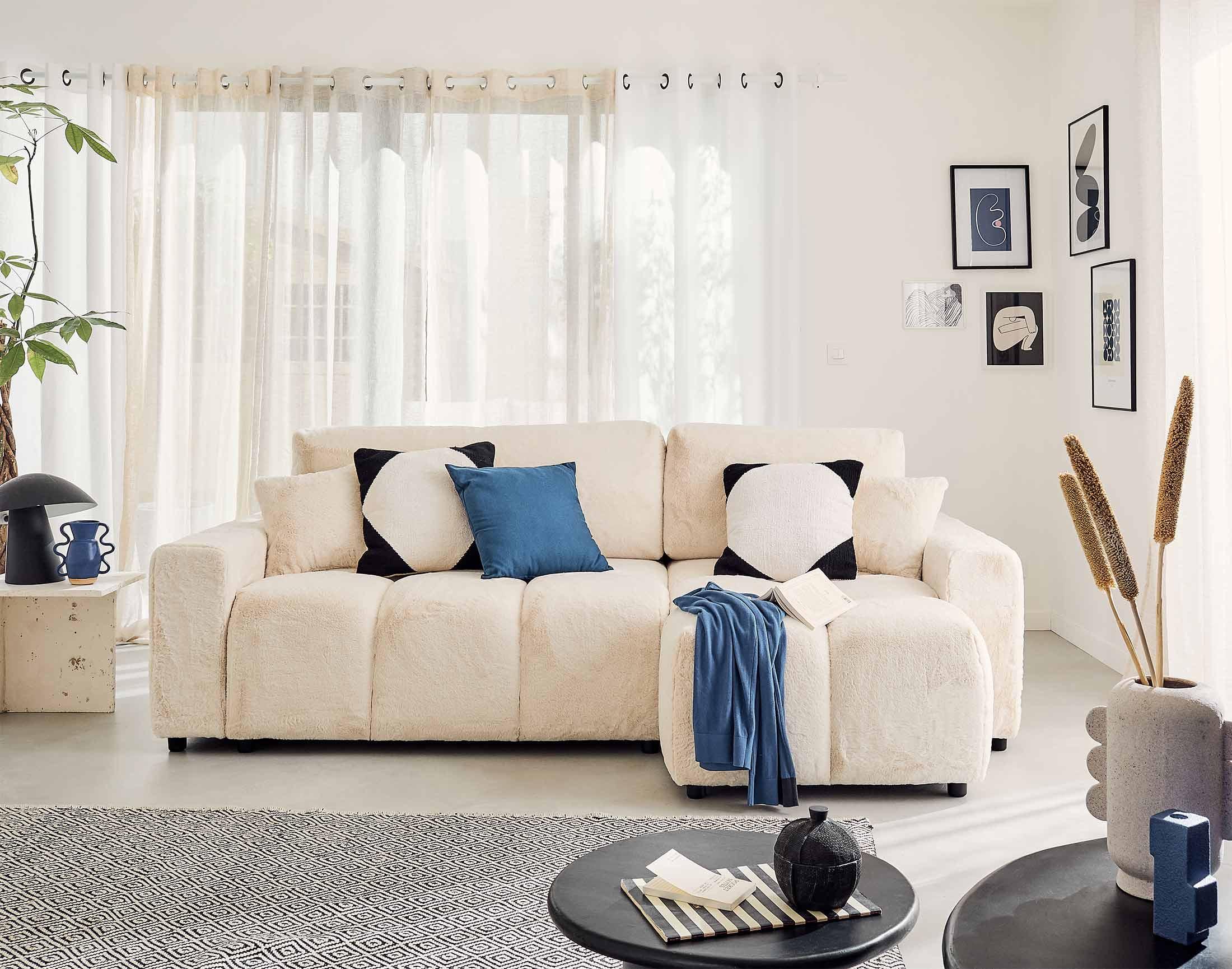 Véritable icône du design, le canapé d'angle réversible 4 places Crocus est la parfaite rencontre entre confort et tendance. Son look original en forme de nuage associé à son revêtement en fausse fourrure tout doux fait de ce canapé, un modèle authentique. Son assise moelleuse et rebondie vous enveloppera pour de doux moments de détente.