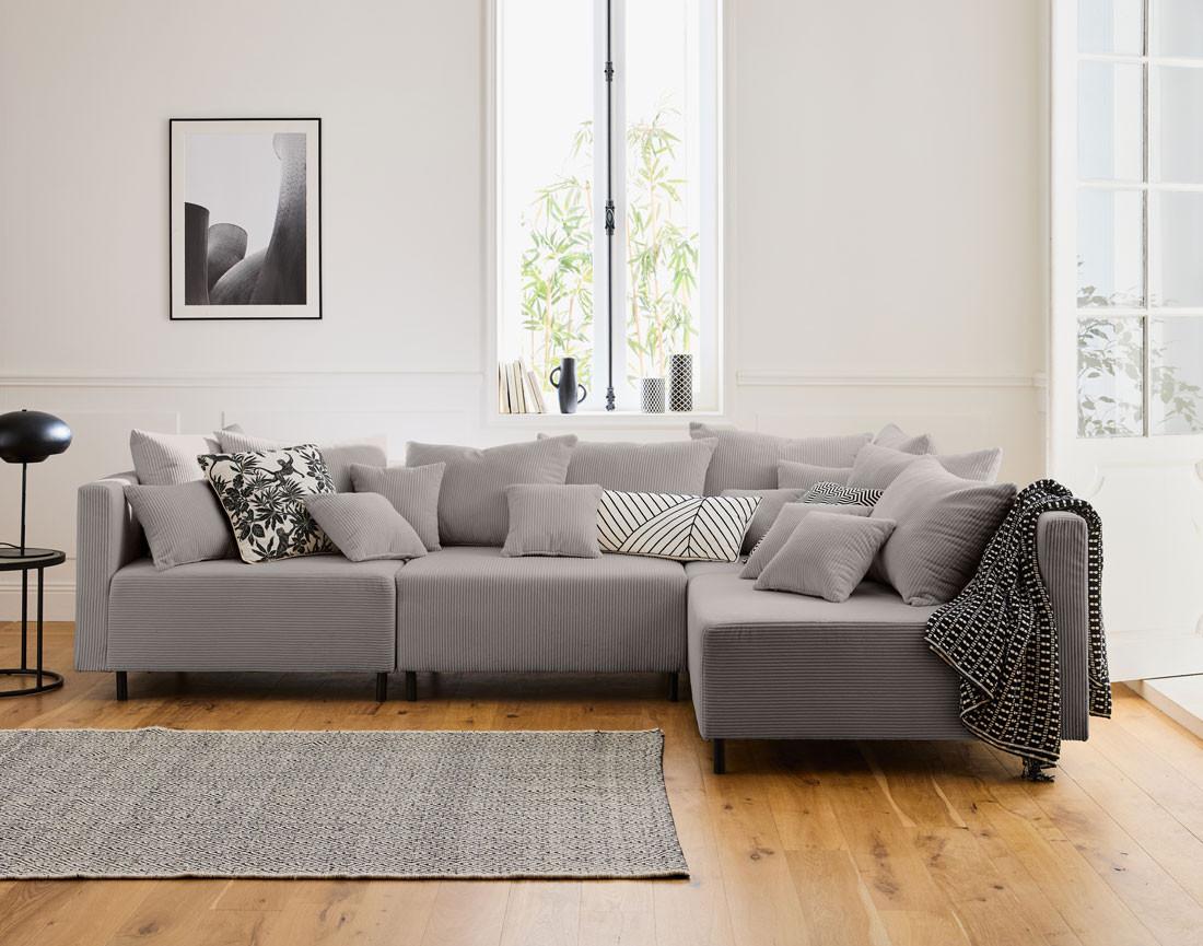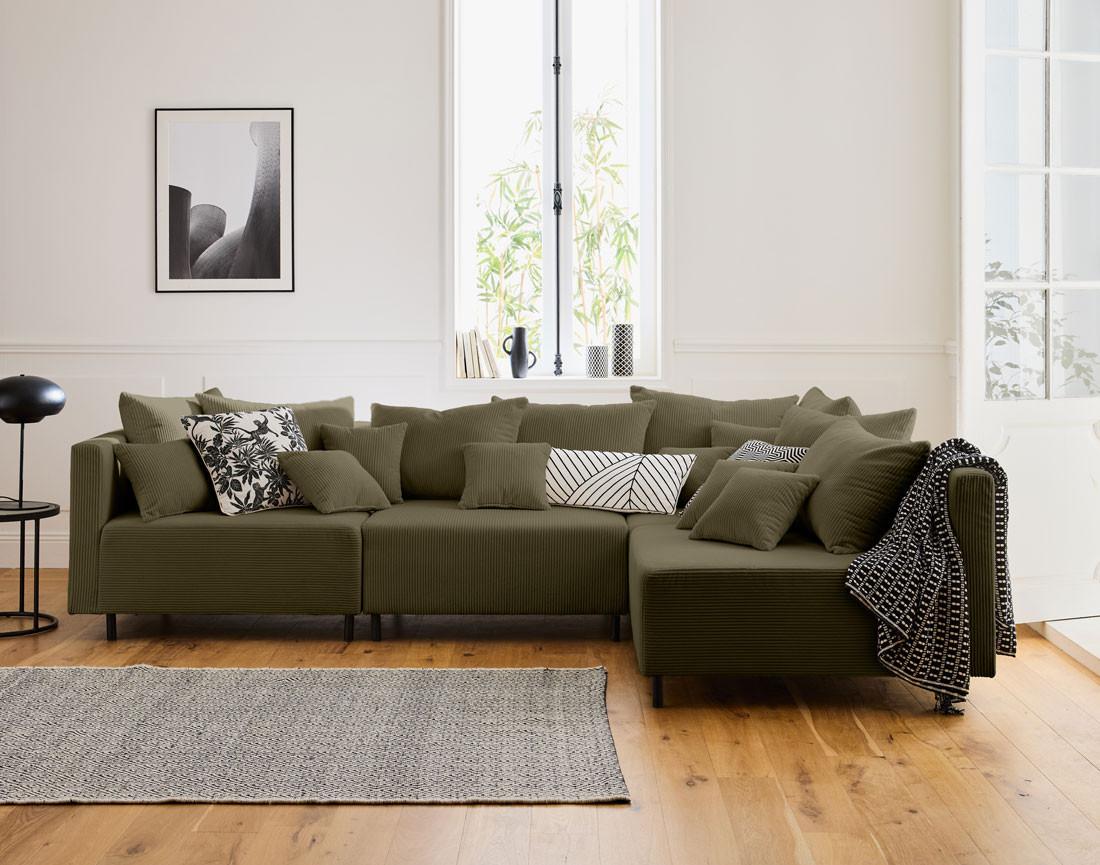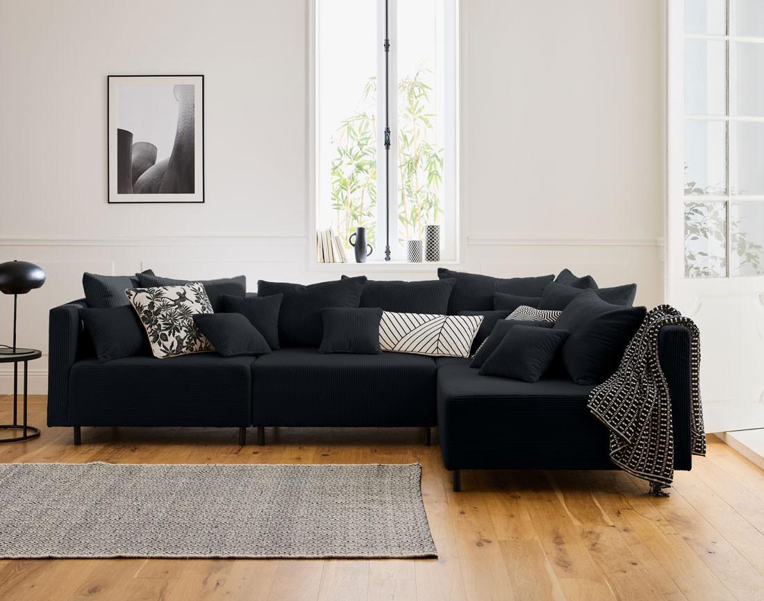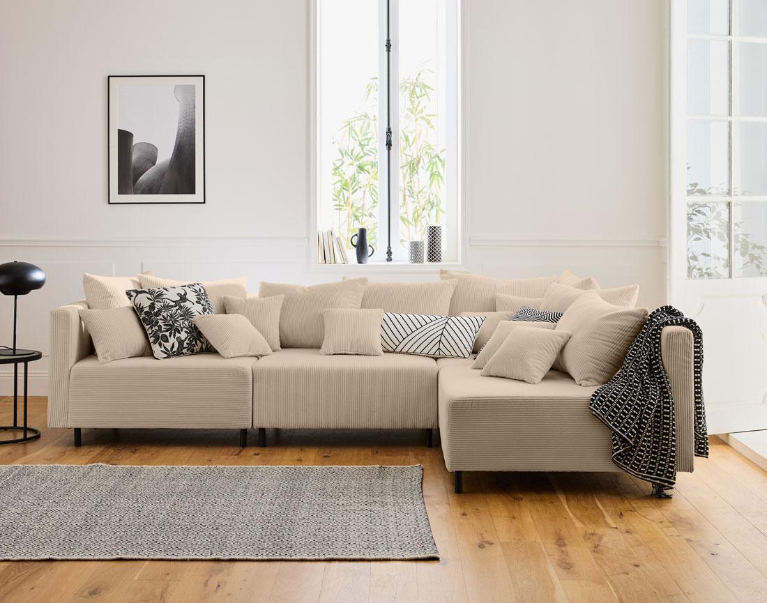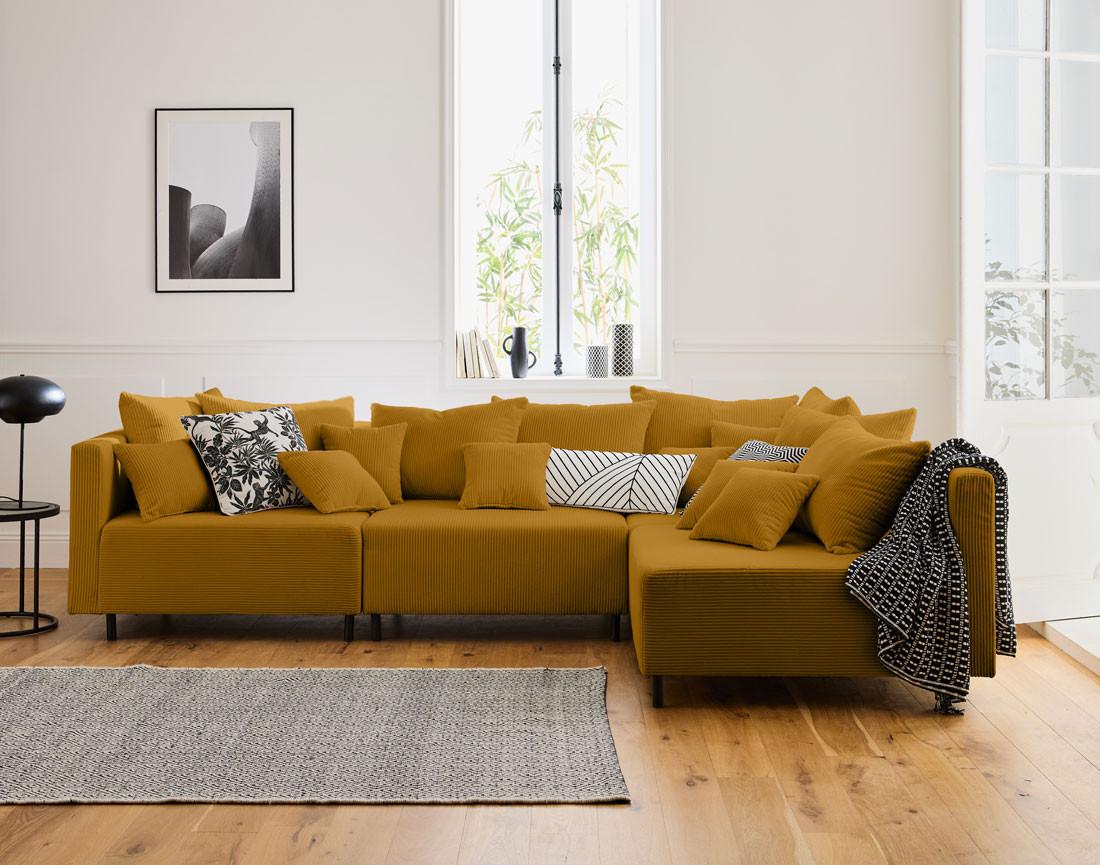 - Présentation de la collection : Laissez-vous séduire par la nouvelle collection Edinburg composée de canapés modulables, de modules et d'un pouf. Elle se démarque par son revêtement en velours côtelé, ses pieds hauts en métal et ses nombreux coussins.