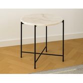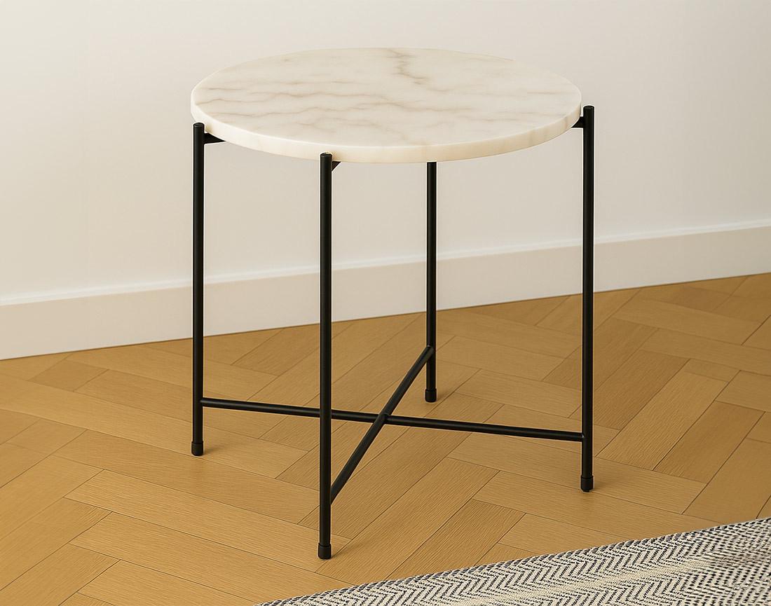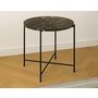 La table basse Ezaro bout de canapé se distingue par son plateau rond en pierre marbrière massive, un matériau naturel aux veines uniques qui varient en teintes, créant ainsi une pièce authentique et élégante. Chaque plateau présente des nuances subtiles, ce qui fait de chaque meuble un modèle véritablement distinct. La base en métal peint par poudrage noir, avec ses détails croisés, allie robustesse et sophistication. Ce design bien pensé marie l'aspect brut de la pierre à la modernité du métal, offrant un contraste visuel séduisant et un meuble à la fois fonctionnel et décoratif.