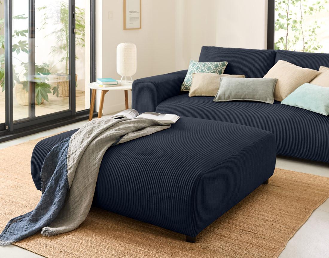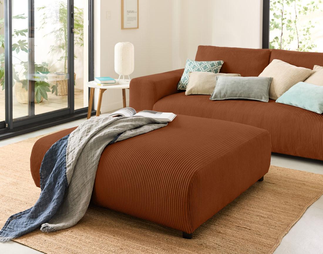 - Détail des matières : Assise : Mousse polyuréthane 30Kg/m3 – Ressorts ondulés – Structure : Bois massif et panneaux de particules - Revêtement en velours côtelé 100% polyester - Pieds en plastique