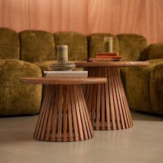 Les pieds des tables basses Kerala arborent un design effet tasseaux de bois très tendance. Cette finition apporte une touche chaleureuse et authentique qui s'harmonise parfaitement avec le manguier massif des plateaux. Ce style inspiré du mobilier vintage s'accorde avec de nombreux styles de décoration, du altique au moderne. Elles s'intégreront ainsi avec élégance dans votre salon.