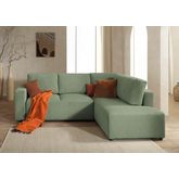 Plus qu'un revêtement en velours côtelé, la gamme Livy est composé d'un coffre de rangement se trouvant sous l'assise qui permet de stocker oreillers, plaids ou autres. Tout en tirant l'assise vers vous et en rabaissant le dossier, un espace de couchage se rend disponible afin d'accueillir vos proches occasionnellement.