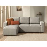 Plus qu'un revêtement en velours côtelé, le canapé Livy est composé d'un coffre de rangement se trouvant sous l'assise qui permet de stocker oreillers, plaids ou autres. En tirant l'assise vers vous et en rabaissant le dossier, il se transforme en lit d'appoint et vous offre un espace de couchage supplémentaire.