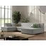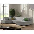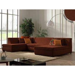 Le canapé d'angle panoramique Malcom est disponible en coloris beige, bleu, gris clair, gris foncé, rouille et vert.