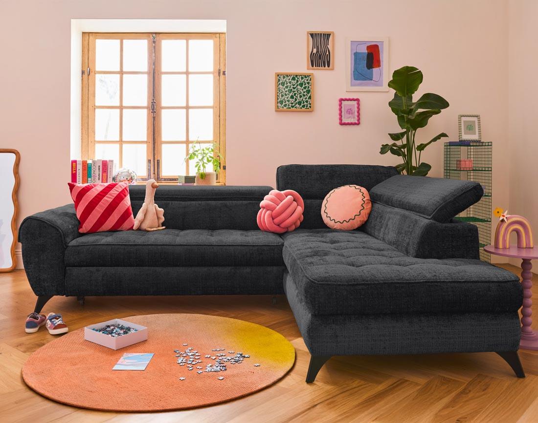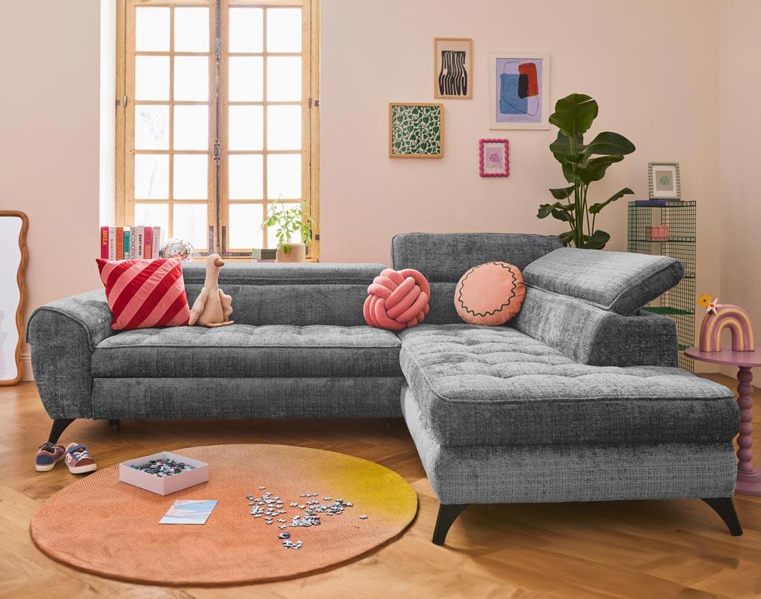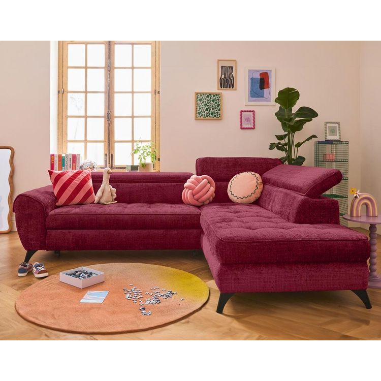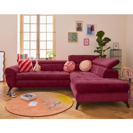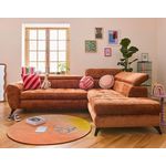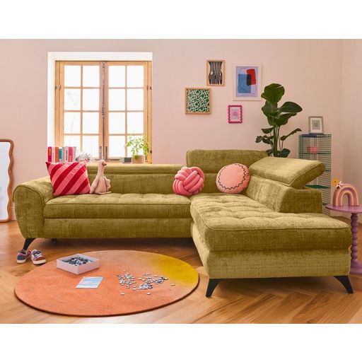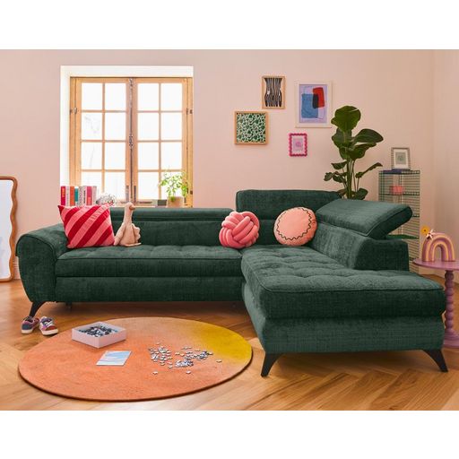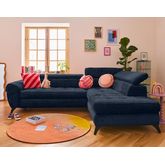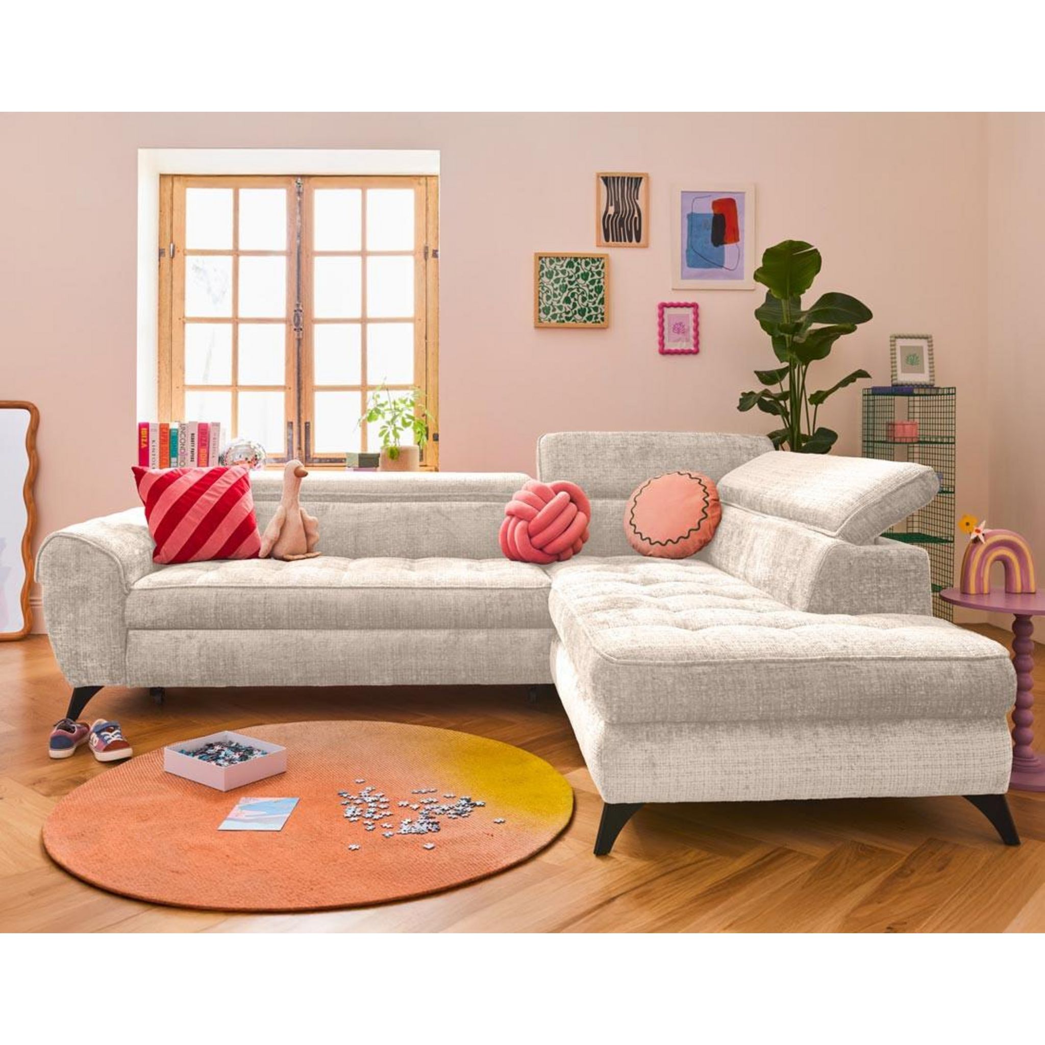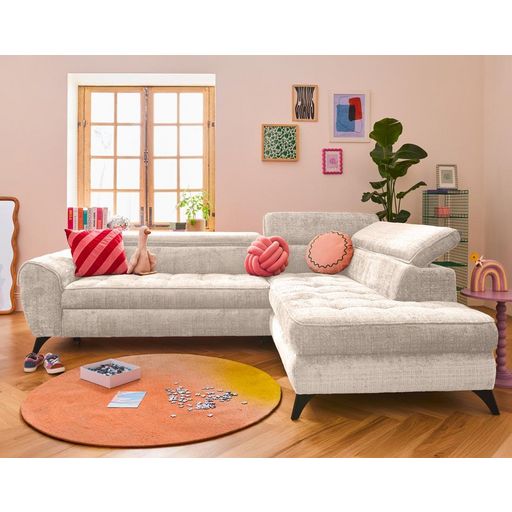 Marlo - canapé d'angle droit 5 places convertible avec coffre et têtières en velours texturé