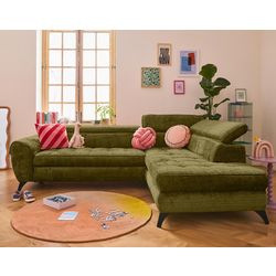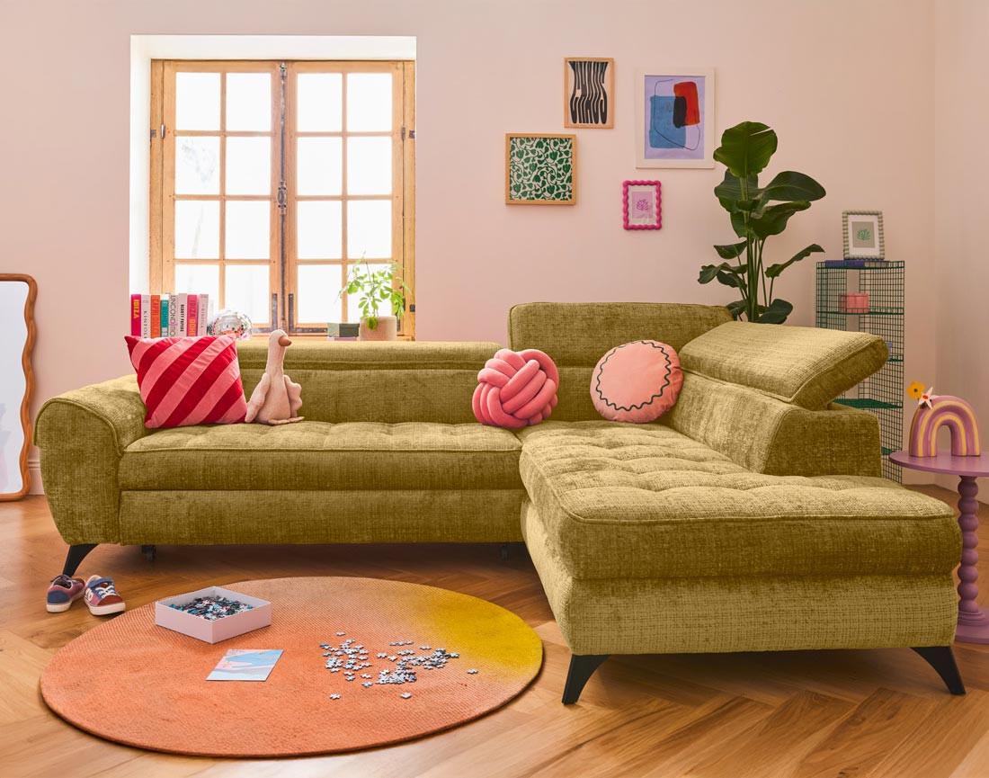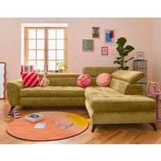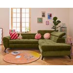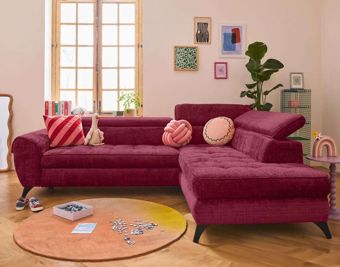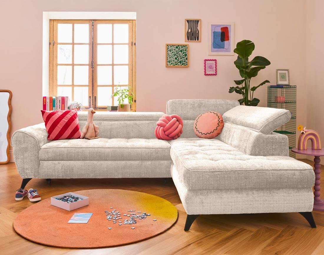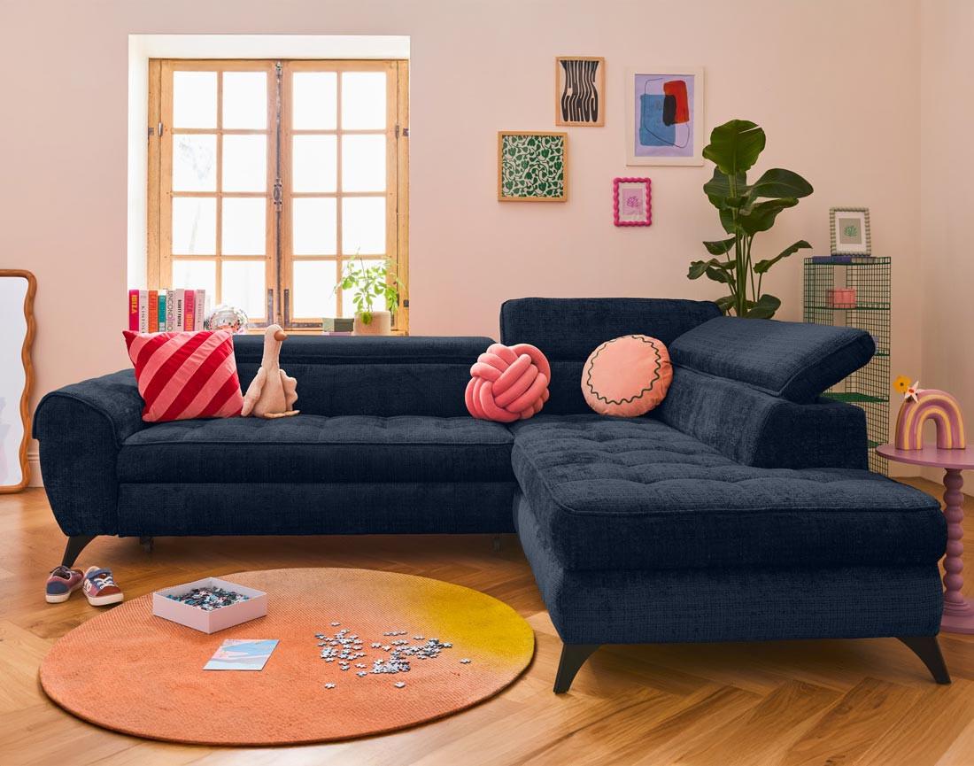 Marlo - canapé d'angle droit 5 places convertible avec coffre et têtières en velours texturé