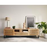 Avec ce meuble TV, vous pouvez disposer d'un espace de rangement supplémentaire car grâce à ses deux portes, son tiroir et sa niche, vous pourrez y ranger vos appareils multimédias. Son plateau supérieur de 200 cm pourra accueillir votre télévision ou encore vos objets de décoration.
