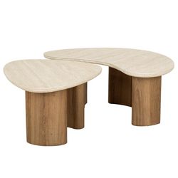 Mohea - lot de 2 tables basses gigognes - effet travertin et bois - 88 et 65 cm
