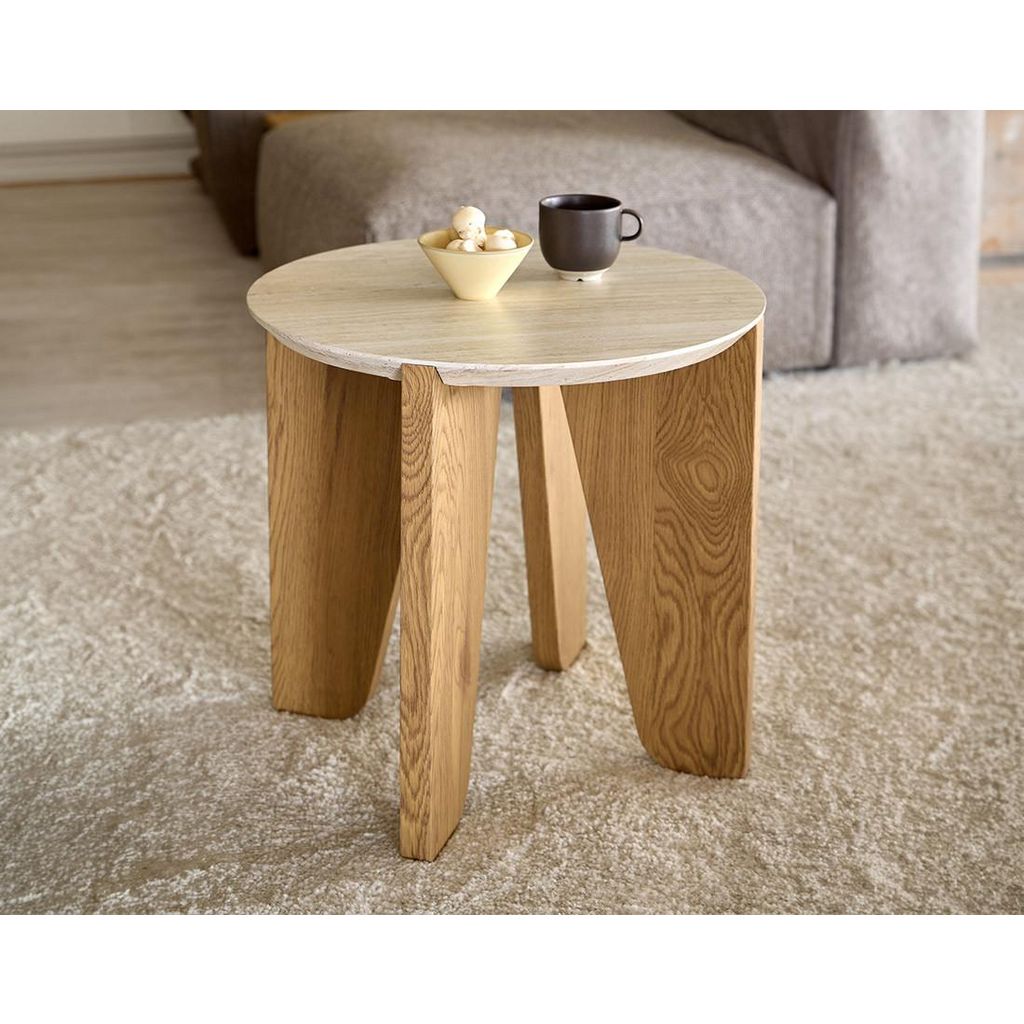 Une table d'appoint raffinée avec un plateau effet travertin et des pieds en chêne sauvage