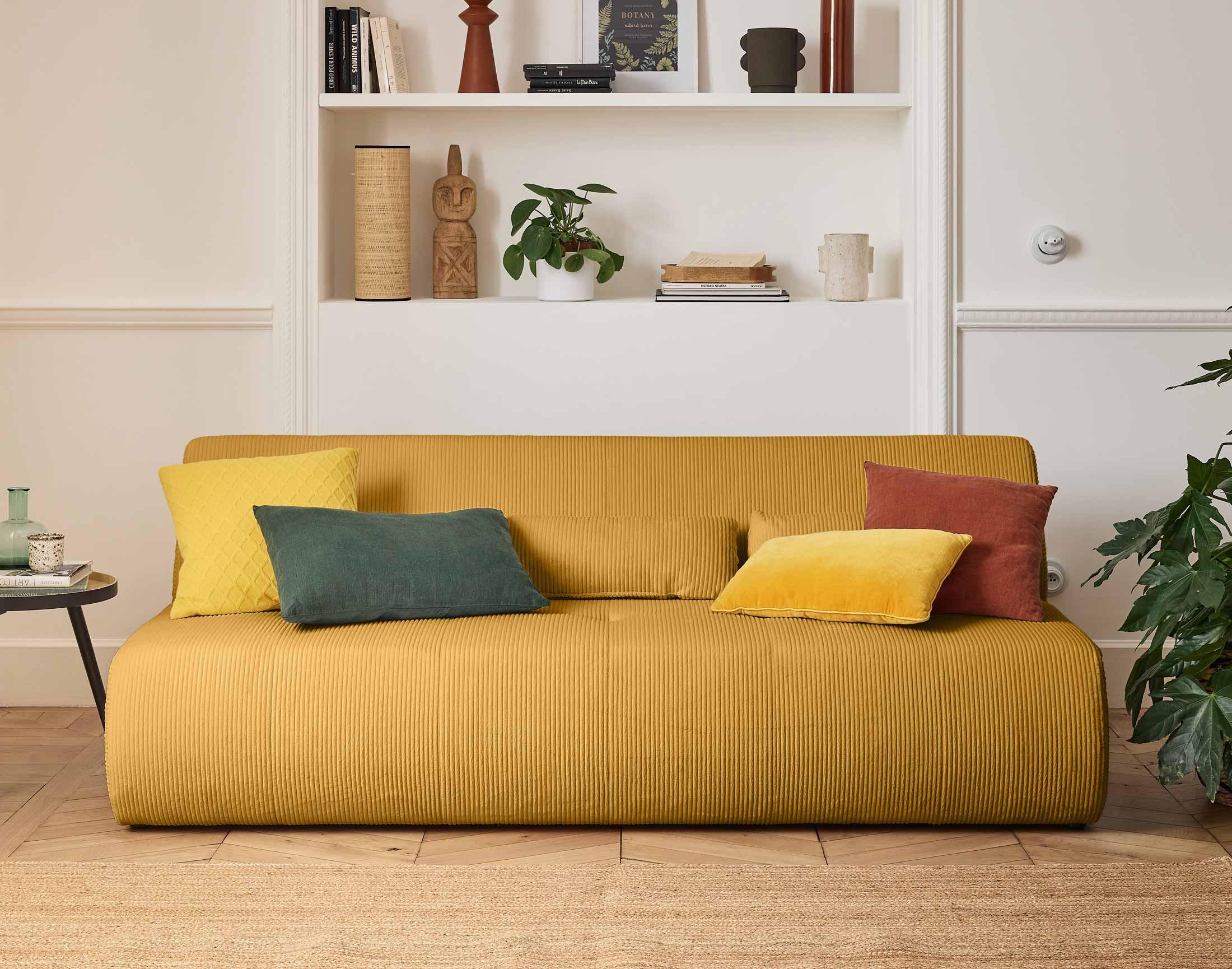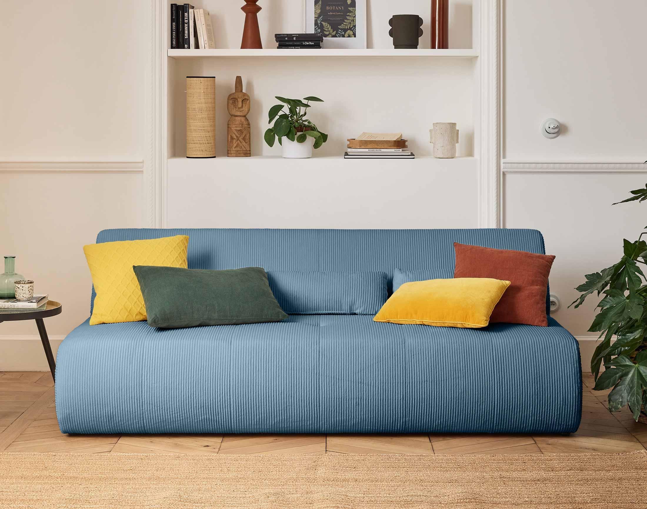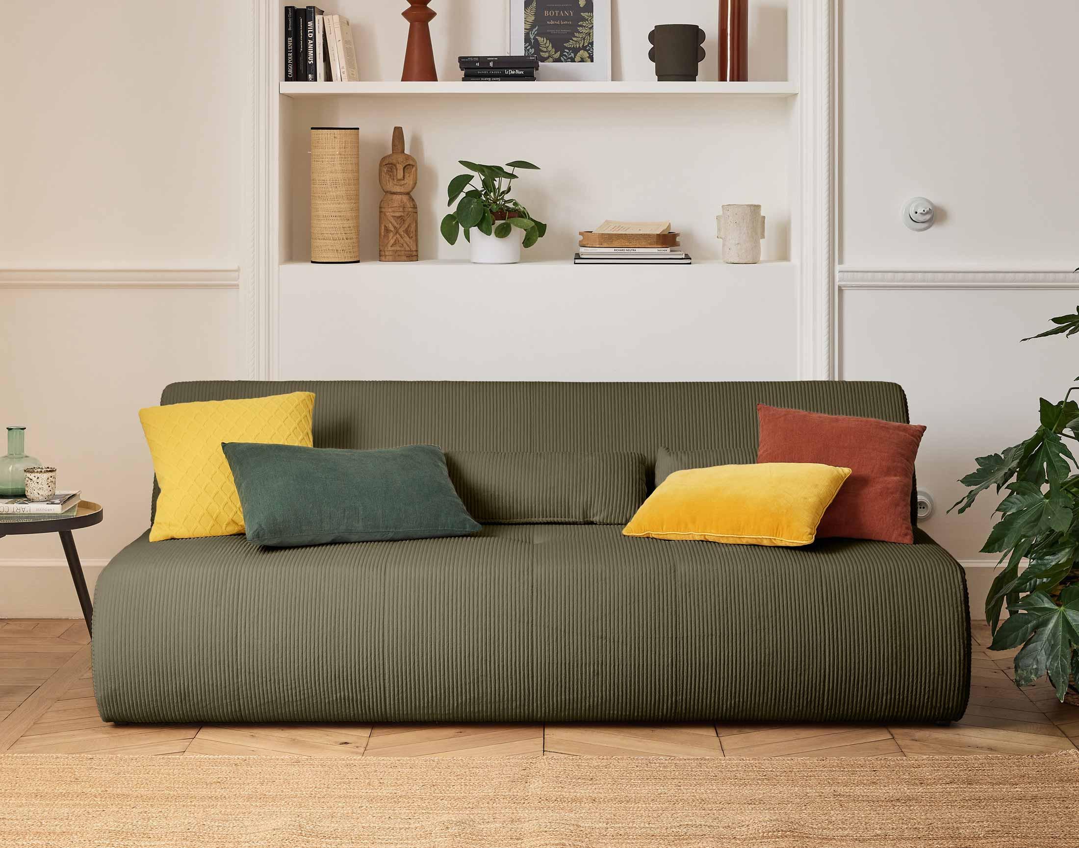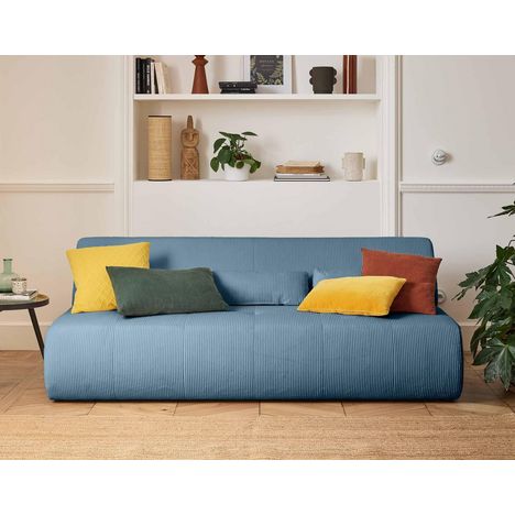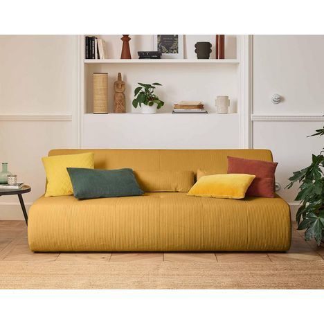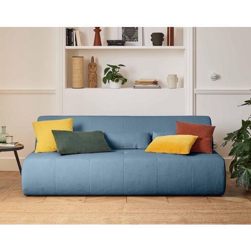 - Détail des matières : Assise : Mouse polyuréthane 28kg/m3 – Dossier : Mousse polyuréthane de densité 21kg/m3 – Ressorts Sinusoïdale – Structure en bois et panneaux de particules – Revêtement en velours côtelé – Pieds en plastique