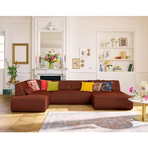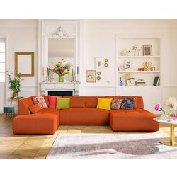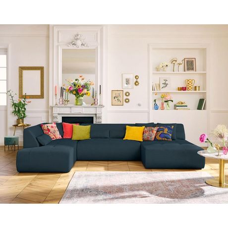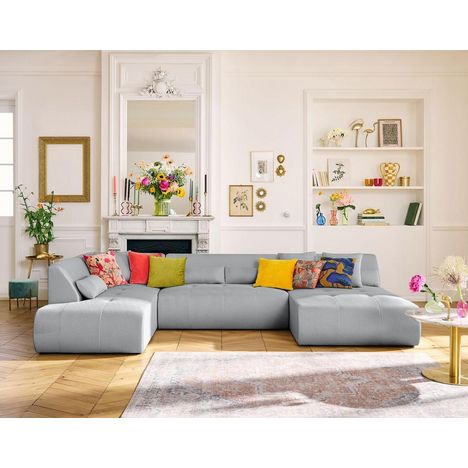 Caractéristiques techniques :Origine : EuropeGarantie : 2 ansType de canapé : Canapé panoramiqueType d'angle : Panoramique UPosition de l'angle : Angle gaucheNombre de places : 7Modulable : NonEquipement : 6 coussins décoratifs inclusMatière de la structure : Bois aggloméré et panneaux de particules