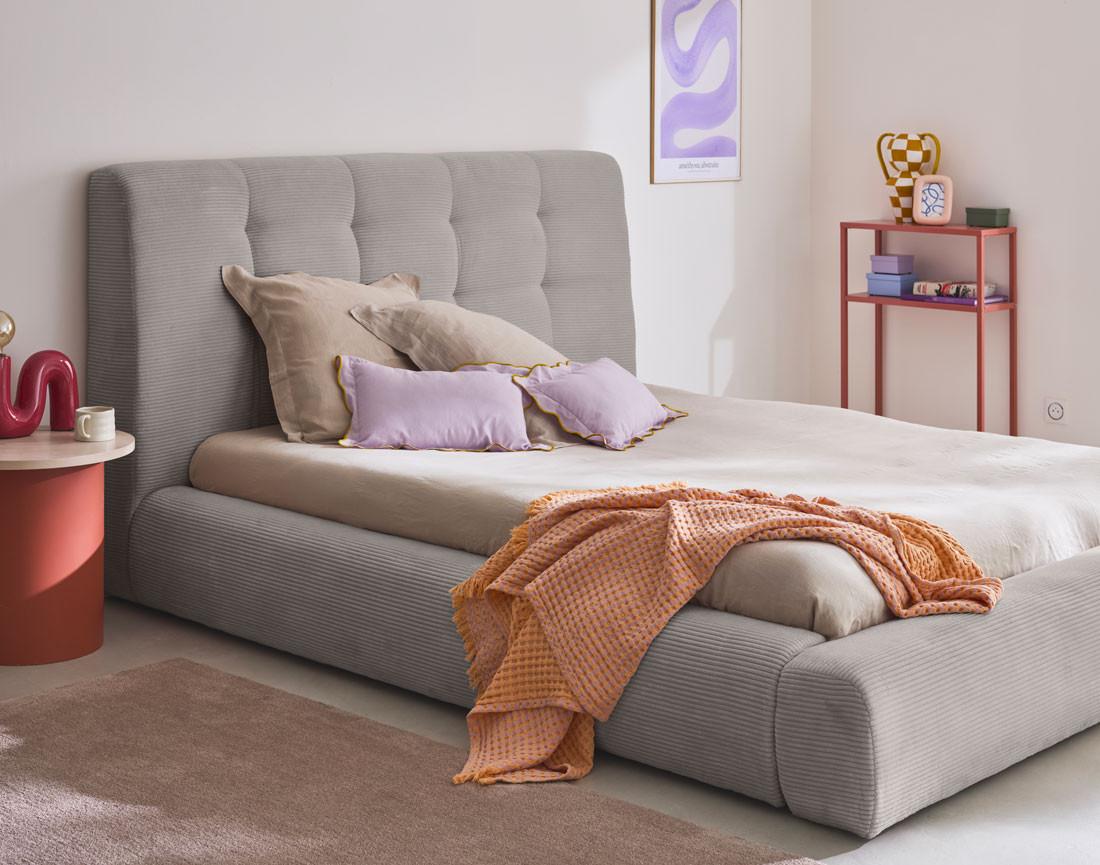 - Détail des matières : Matières principales : Panneaux de fibres - Essence de bois : Hêtre - Revêtement du lit : Velours côtelé – Pieds en plastique - revêtement en velours côtelé doux