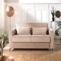 Le canapé lit Owen est équipé d'un sommier métallique avec mécanisme à ouverture express qui permet de déplier et replier le lit très facilement sans enlever les coussins d'assise et de dossier. Côté confort, l'assise est composée d'une mousse polyuréthane de 25kg/m3 tout comme les deux coussins de dossier de 80x50 cm et épais de 12 cm. La nuit, en position lit, il peut accueillir deux personnes grâce à ses dimensions standards de 190x140 cm et vous garantir un sommeil confortable et agréable comme dans un lit normal.