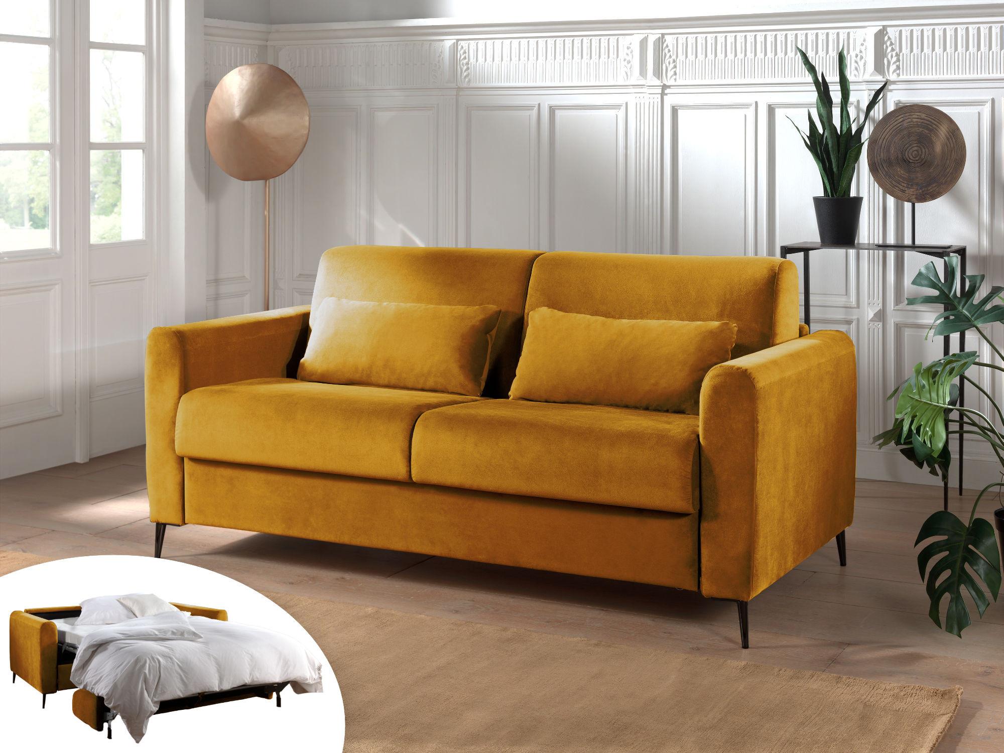 Fabriqué en Europe, le canapé à ouverture express Owen a un design moderne et épuré qui s'intégrera dans une décoration d'intérieur actuelle. Disponible en gris, bleu nuit ou jaune moutarde, son revêtement en velours donnera une ambiance chaleureuse et confortable à votre pièce à vivre.
