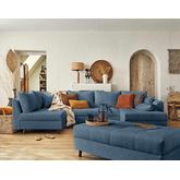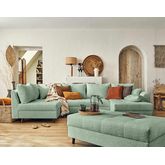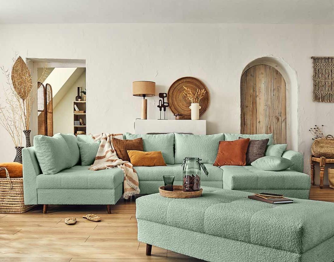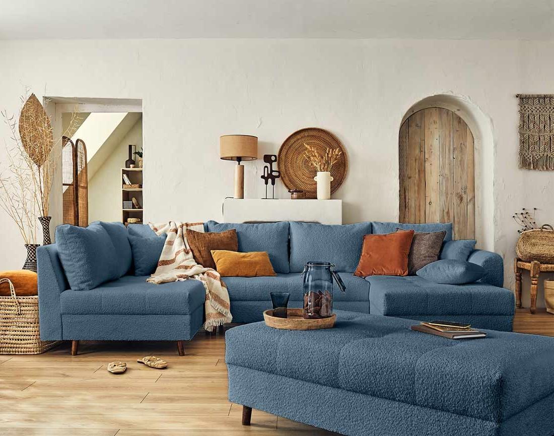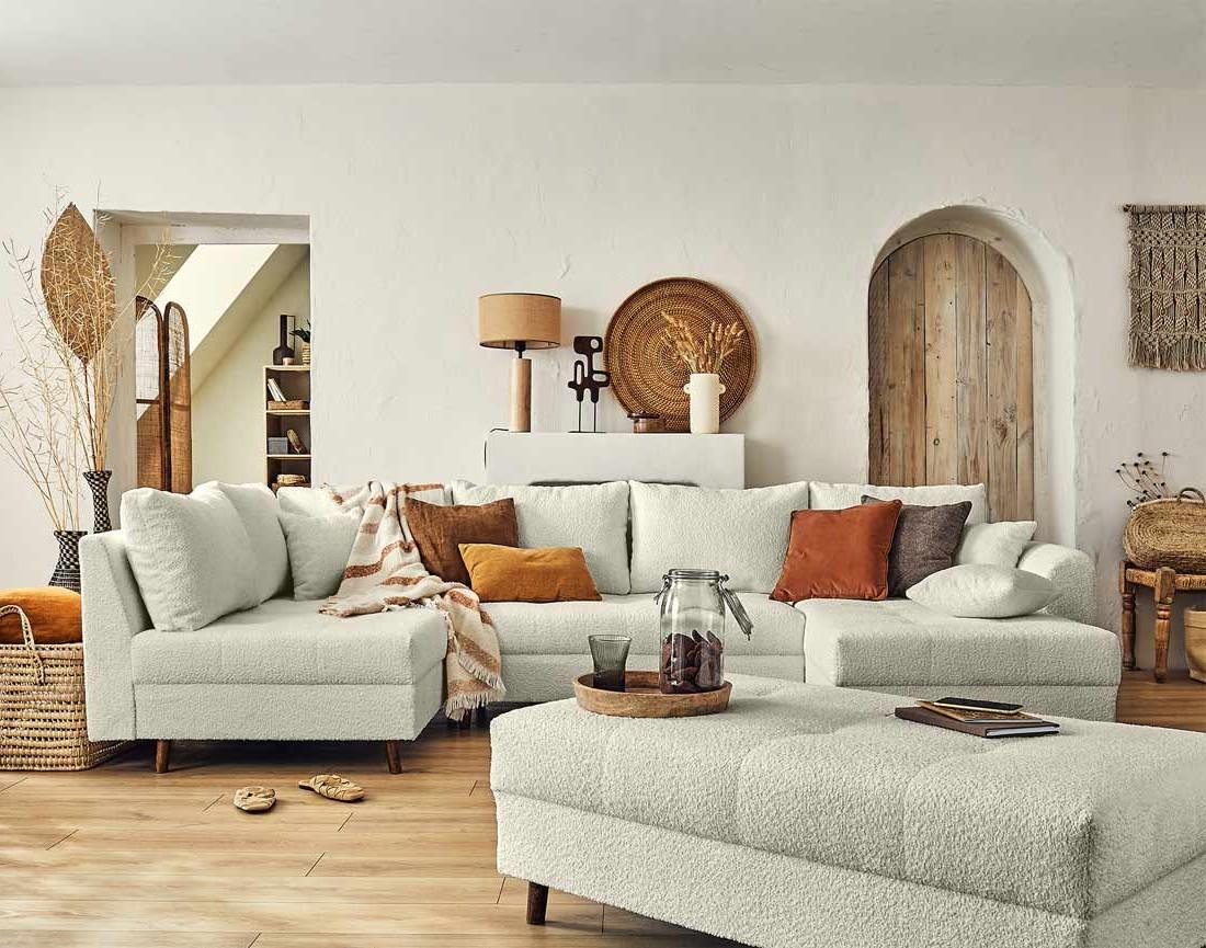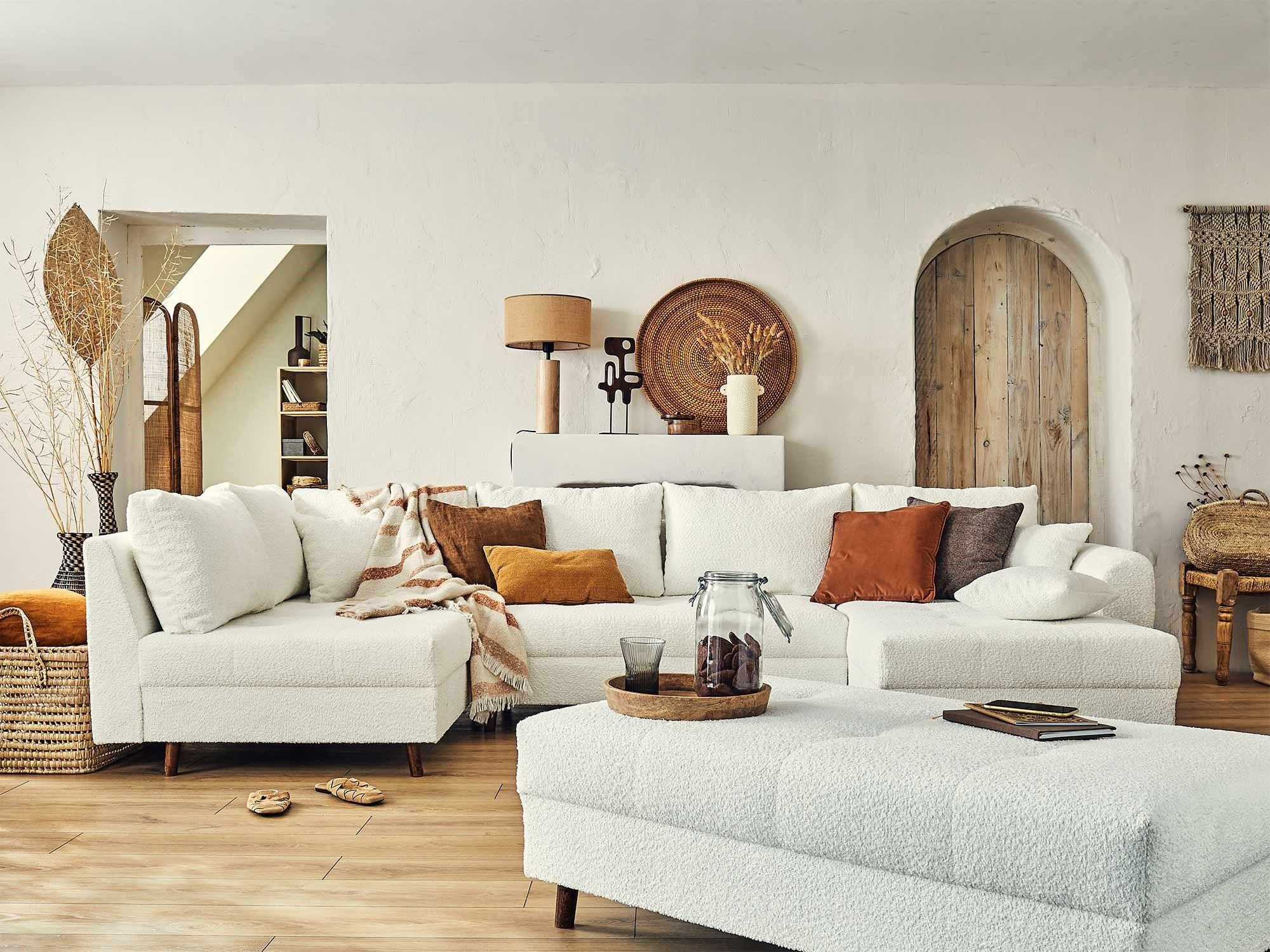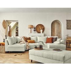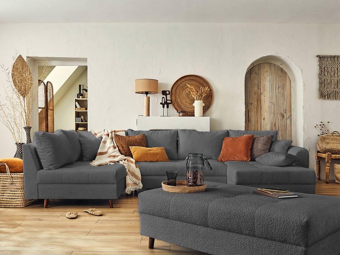 Disponible en plusieurs coloris, le canapé panoramique d'angle et le pouf Rune rendront votre intérieur tendance et cocooning !