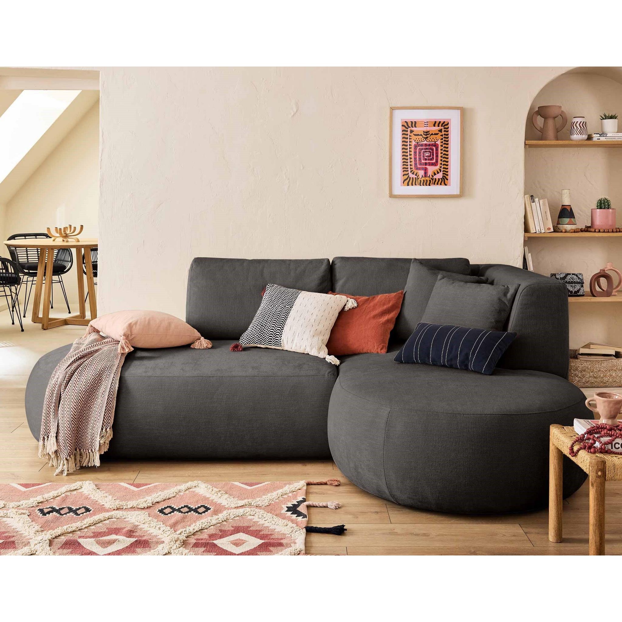 Imaginez-vous blotti dans un nuage de douceur, enveloppé par une chaleur réconfortante. C'est la sensation que vous procurera le canapé d'angle droit Santorini dès que vous y prendrez place. Son tissu texturé d'une finesse incomparable vous invite à la détente. Chaque contact avec le revêtement du canapé Santorini est une véritable caresse pour votre peau.