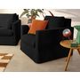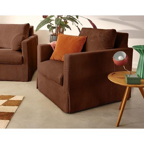 - Détail des matières : Assise et dossier : Mousse polyuréthane 30kg/m3 – Ressorts ondulés – Structure : Bois massif et panneaux de particules - Housse en velours côtelé 100% polyester - Pieds en plastique