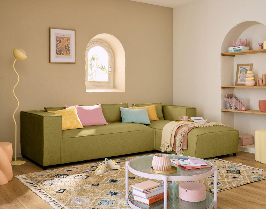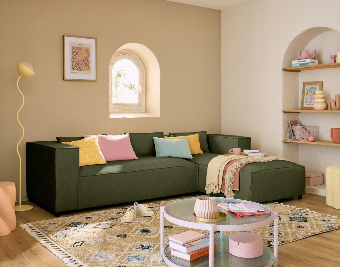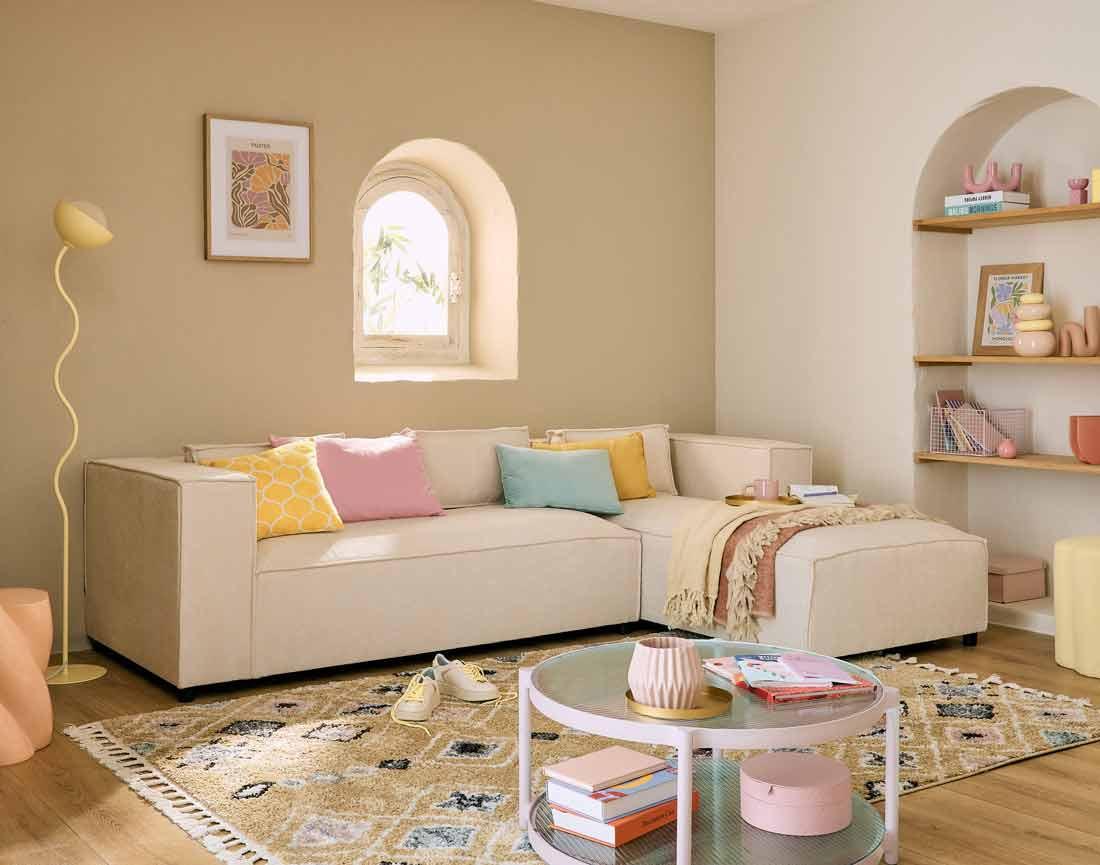 Transformez vos soirées cinéma en une superbe expérience grâce au canapé Stella. Sa large assise permet à une famille de 4 personnes de s'installer confortablement. Le design en angle droit maximise l'espace de manière intelligente. Le revêtement en velours texturé ajoute une sensation de douceur et crée une atmosphère cosy et accueillante.