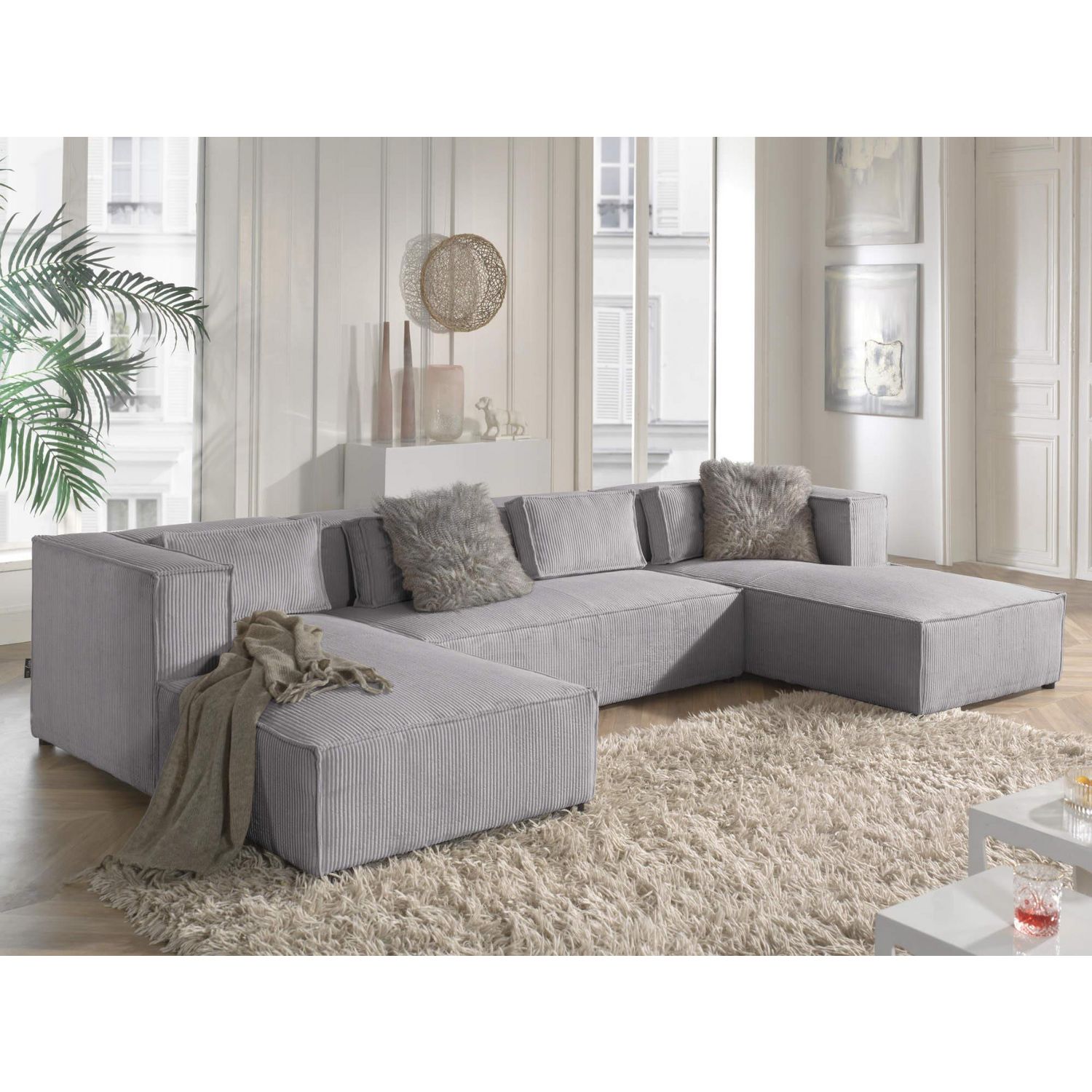 Un canapé panoramique en velours côtelé hyper tendance qui sera parfait pour une ambiance cocooning. Dans ce canapé Stella aux formes épurées, vous pourrez vous enfoncez autant dans l'assise que dans le dossier qui s'adapte à votre position. 4 coussins décoratifs viendront se placer en cales-reins afin que vous soyez confortablement assis. Optez pour du gris ou du beige pour un intérieur aux tendances actuelles ou osez la couleur pour un salon contemporain. Grâce à sa largeur d'assise de 265 cm, vous pourrez accueillir vos proches facilement. Le canapé panoramique Stella est votre futur allié déco et, détente pour toute la famille.