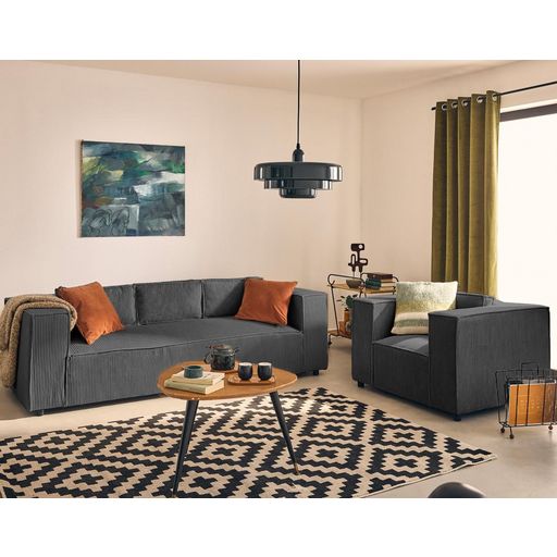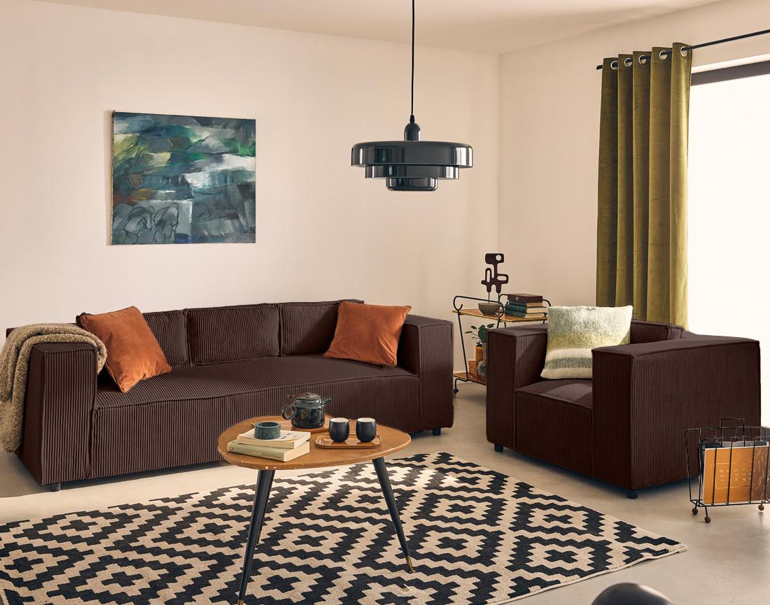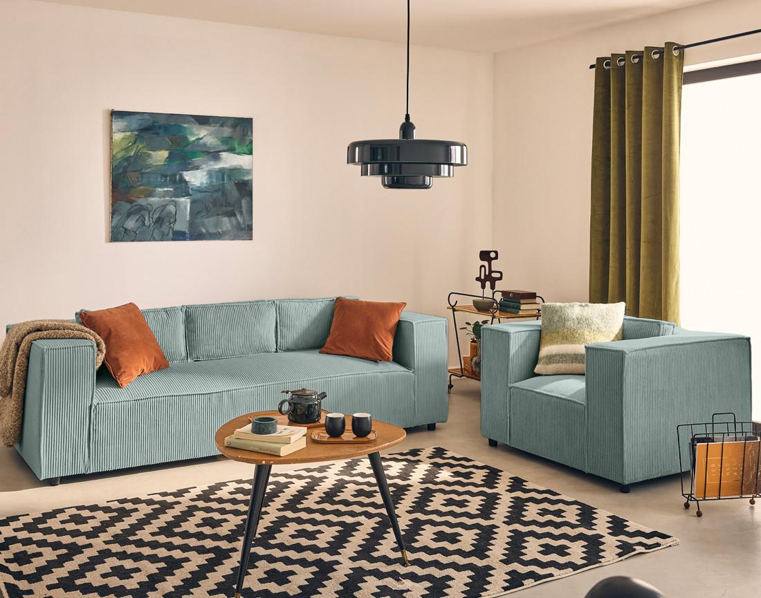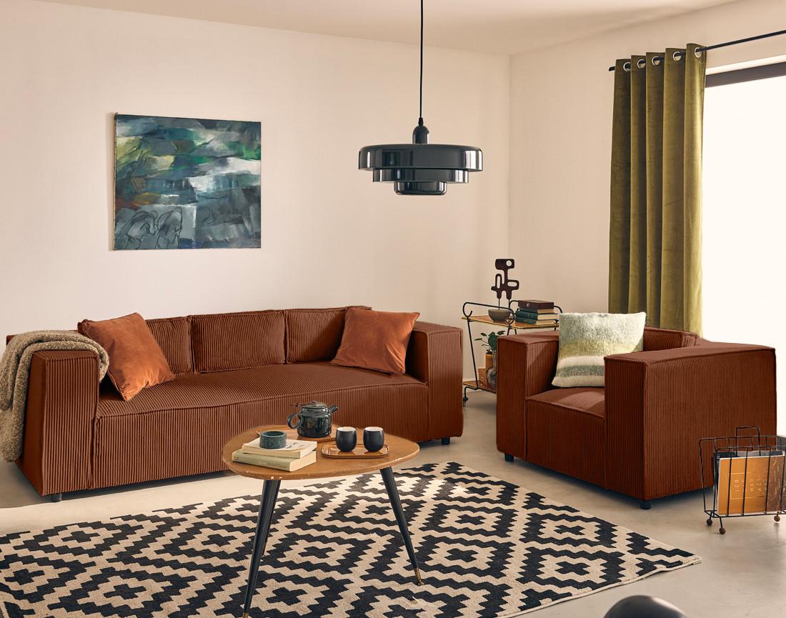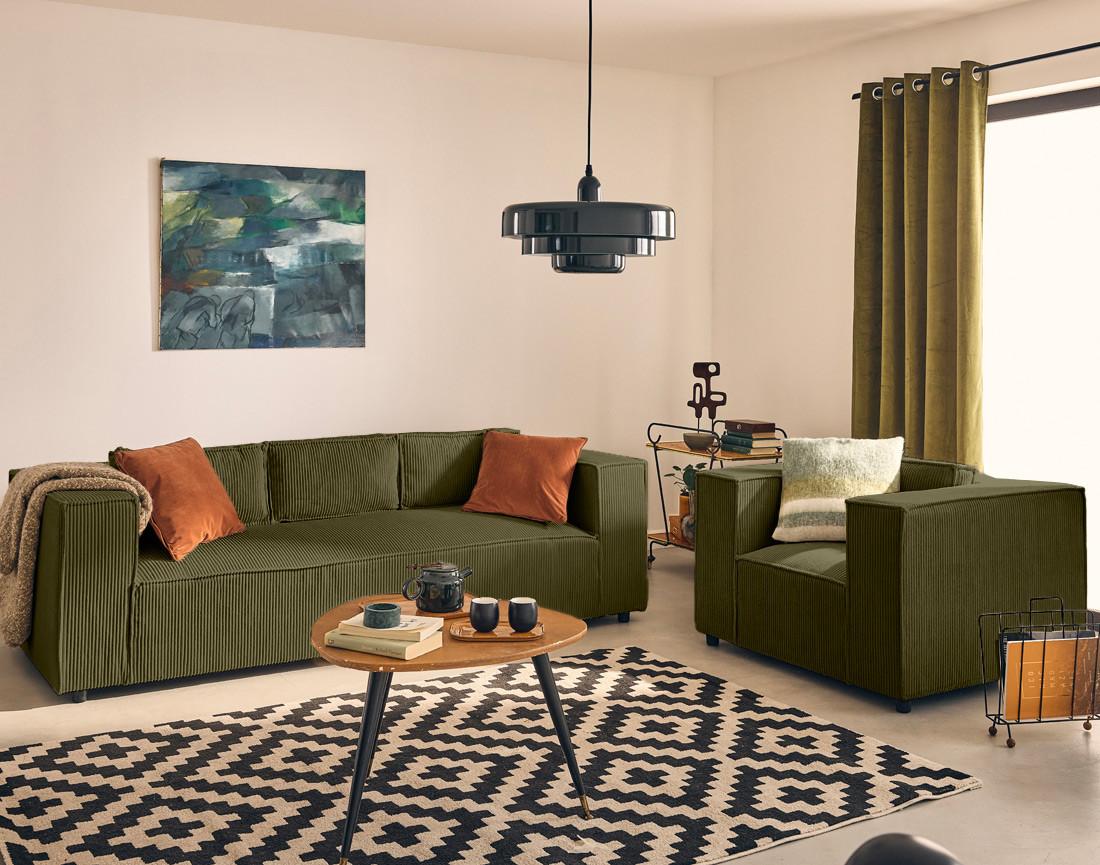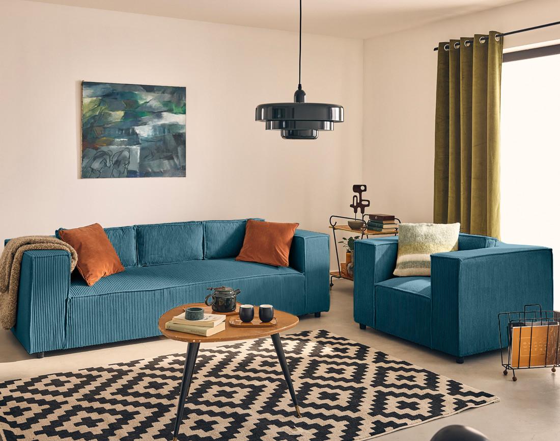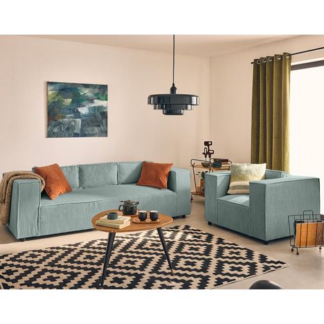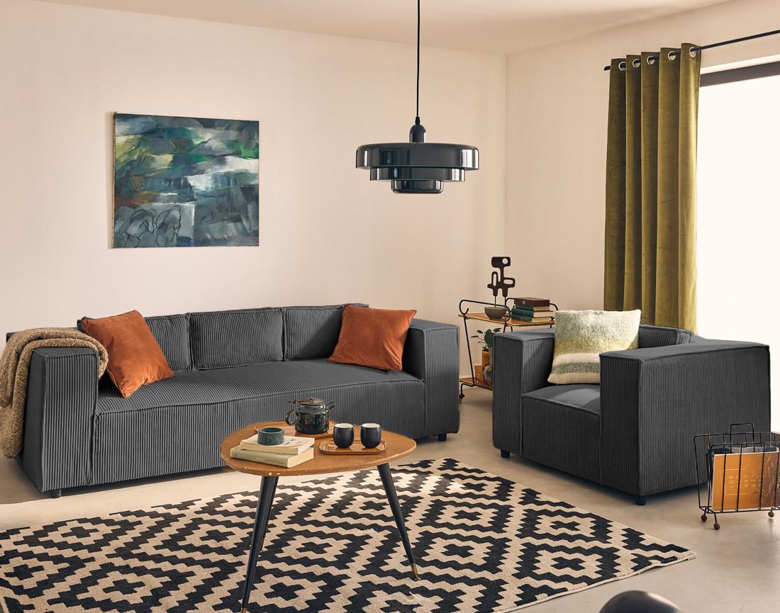 - Détail des matières : Assise et dossier : Mousse polyuréthane 30kg/m3 – Ressorts ondulés – Structure en bois massif et panneaux de particules – Revêtement en velours côtelé 100% polyester – Pieds en plastique
