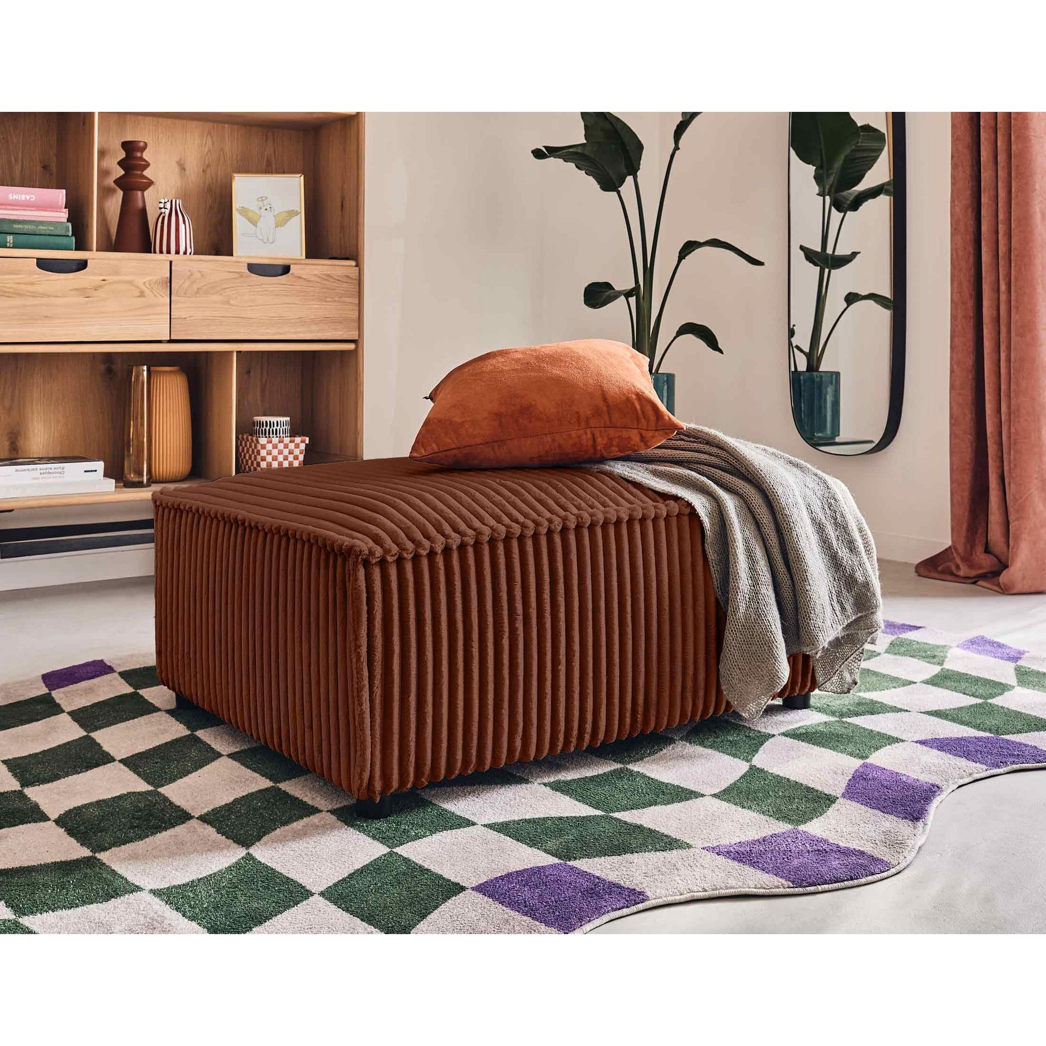 Le pouf Stella en velours côtelé grosses côtes sera un allié pour ajouter une place assise supplémentaire dans votre salon ou encore comme repose-pieds afin de pouvoir vivre un moment détente. Son revêtement en velours côtelé grosses côtes, aussi doux qu'un plaid, tendance et chaleureux, vous apportera un confort d'assise de qualité.