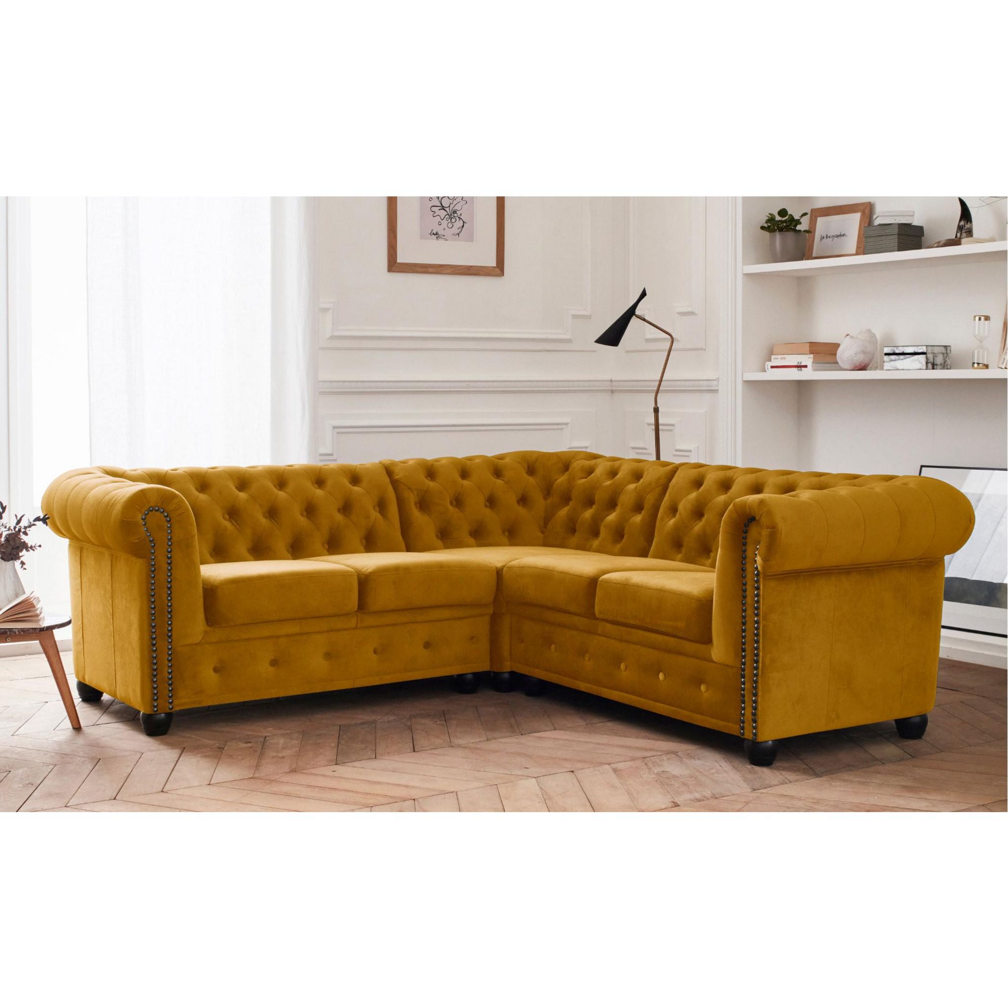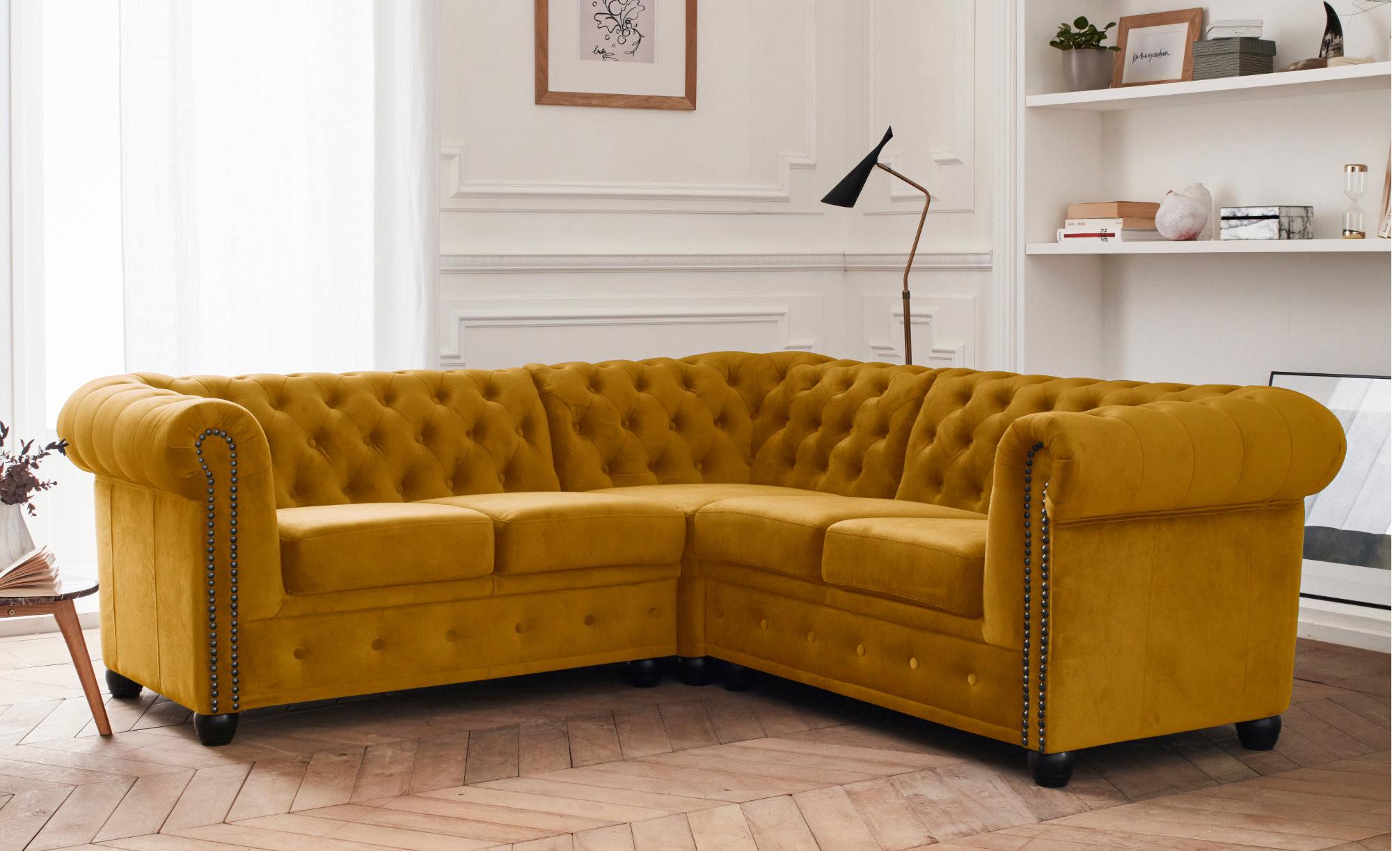 Le canapé d'angle 5 places William reproduit le style affirmé d'un Chesterfield avec la modernité d'un tissu velours. Celui-ci apporte une douceur au touché et une souplesse d'assise. Grâce sa forme unique, ses clous noirs sur les accoudoirs et son capitonnage en finition, il se mariera facilement avec différents types de décoration d'intérieur et donnera du charme et du caractère à votre pièce. Grâce à sa mousse de qualité, son assise profonde et sa méridienne, le canapé d'angle William vous offre un confort optimal. Ce modèle respecte les codes du Chesterfield traditionnel avec ses accoudoirs et dossier enroulés. Son capitonnage donne une texture et un relief au canapé. Il est disponible en 5 coloris : gris, bleu canard, jaune, vert et bleu nuit.