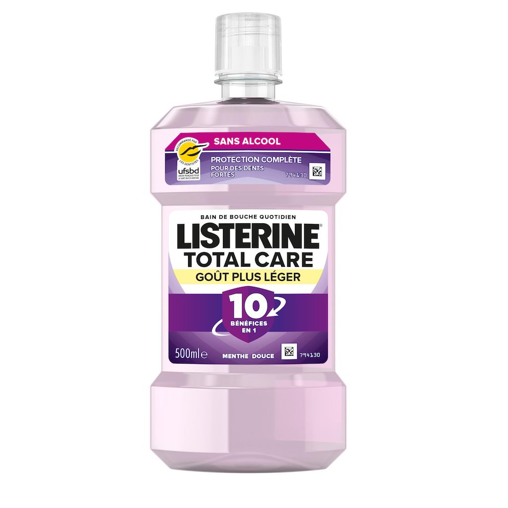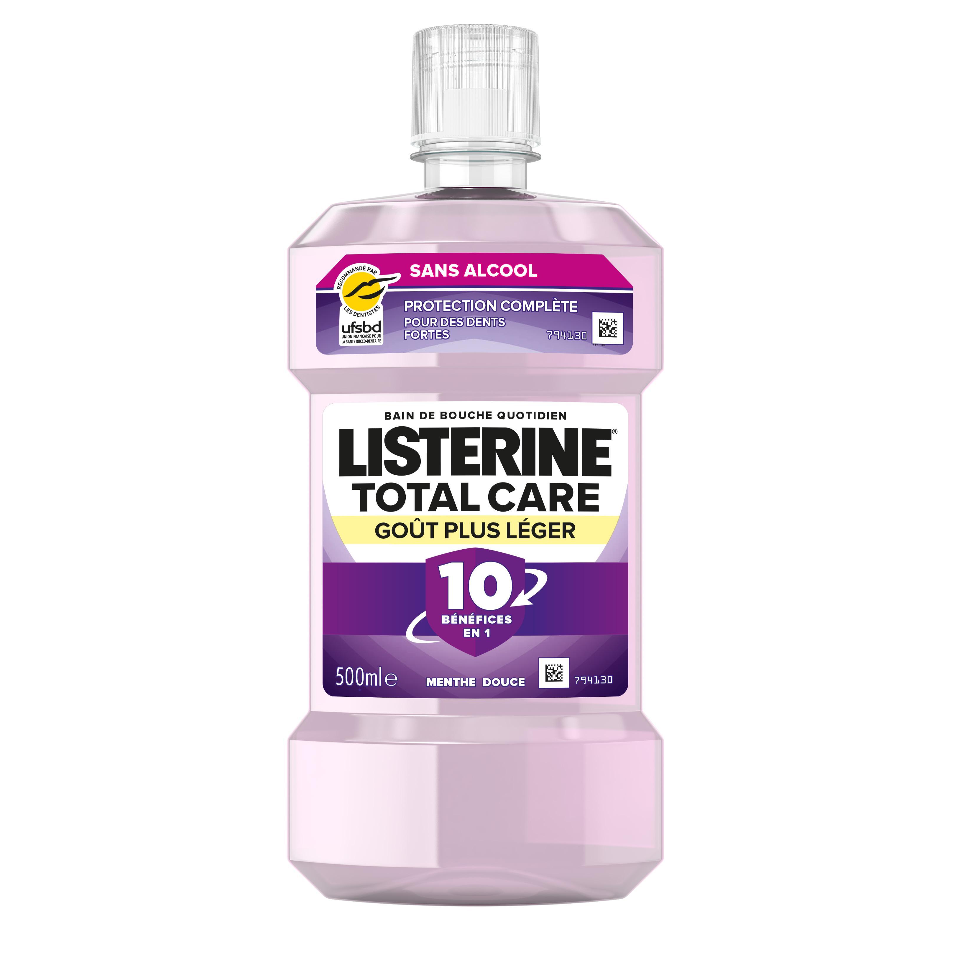 C’EST PROUVÉ*, UTILISÉ DEUX FOIS PAR JOUR, LISTERINE® TOTAL CARE AU GOÛT PLUS LÉGER ET SANS ALCOOL, NETTOIE ET PROTÈGE AVEC 10 BÉNÉFICES POUR UNE HYGIÈNE BUCCO-DENTAIRE TOTALE: