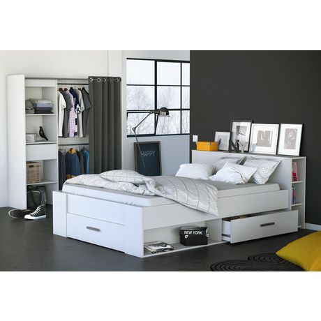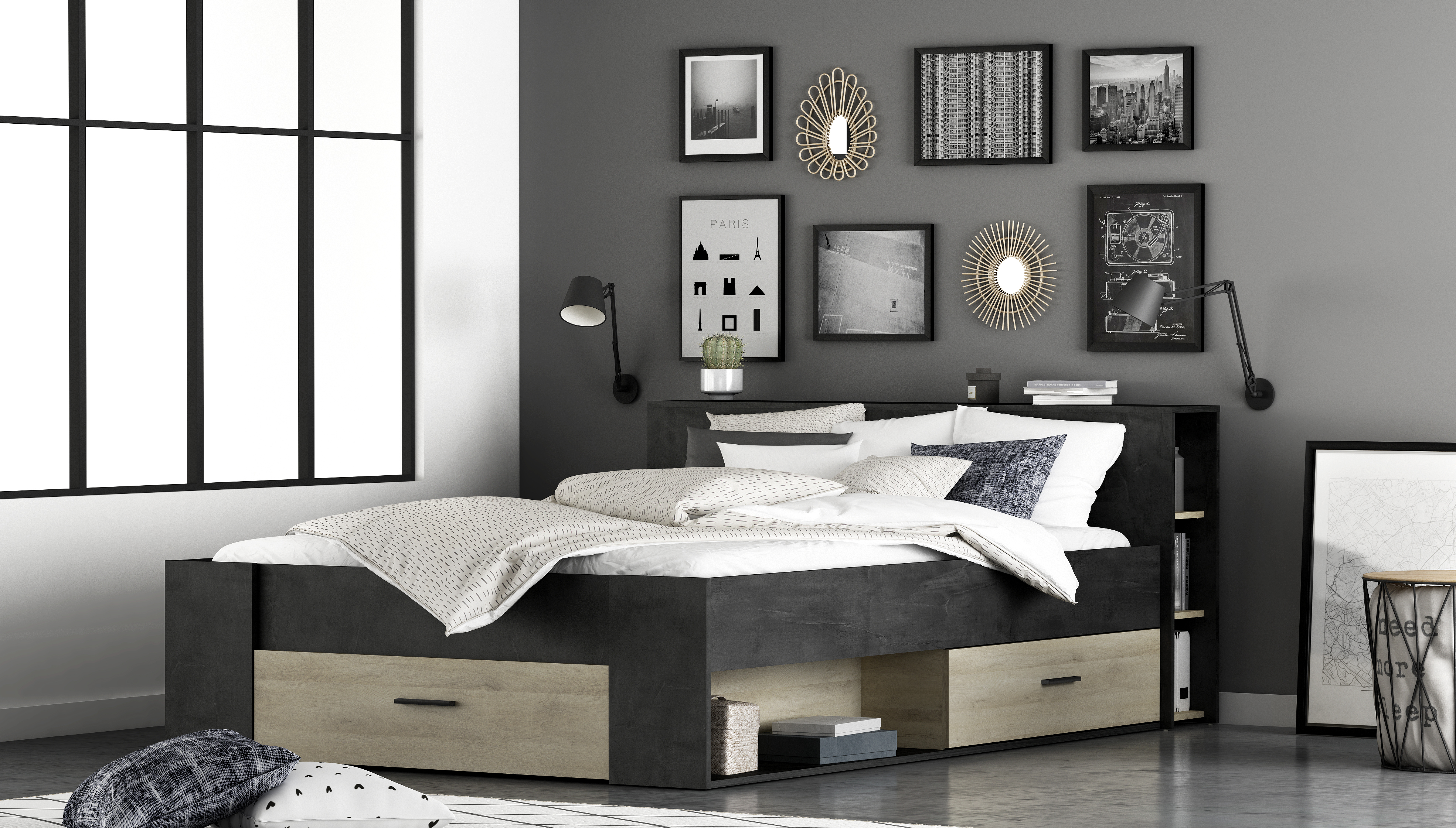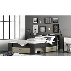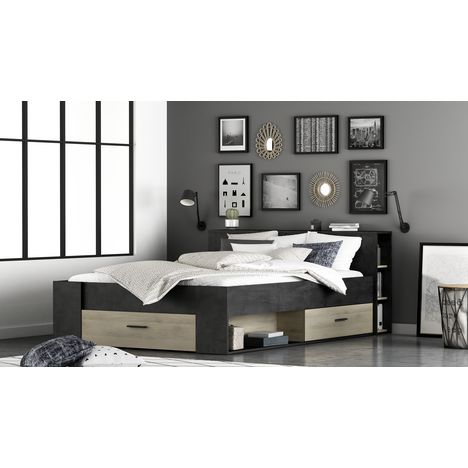 - Tête de lit avec étagère sur toute la largeur et 2 bibliothèques 3 niches.