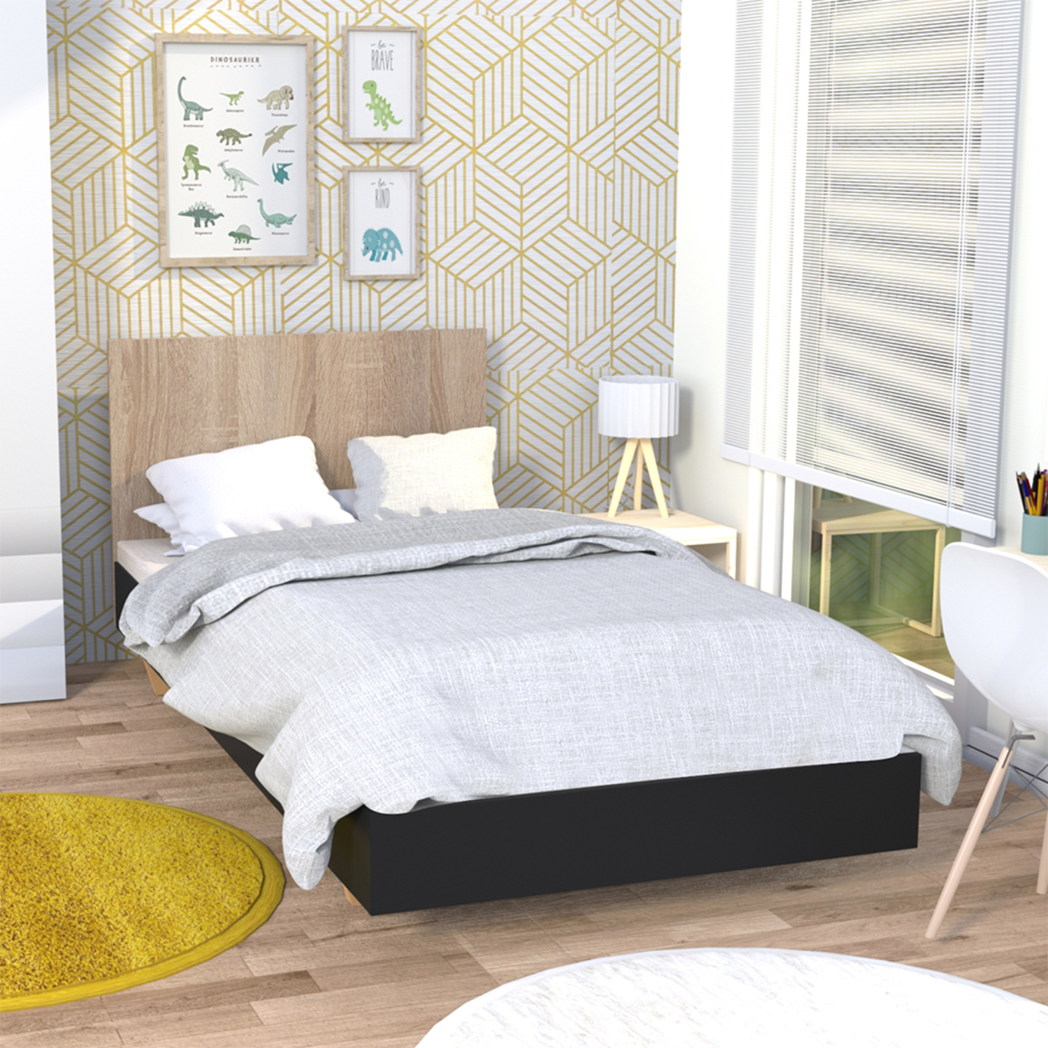 Un lit noir et chêne, look simple et intemporel pour un style épuré et contemporain facilement associable dans une chambre d'amis, d'enfant ou d'ado. Ce lit offrant un couchage une place avec sommier vous garantit confort et solidité pour de douces nuits !