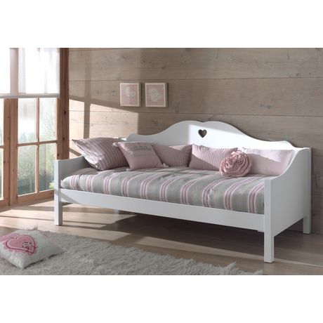 Le lit banquette Maude apporte une allure chic et douce à votre chambre. Les contours travaillés associés à un motif coeur lui donnent un style romantique. Ce lit en pin et mdf présente un couchage de 90x200 cm et possède un coloris blanc avec finition laquée indémodable et solide.