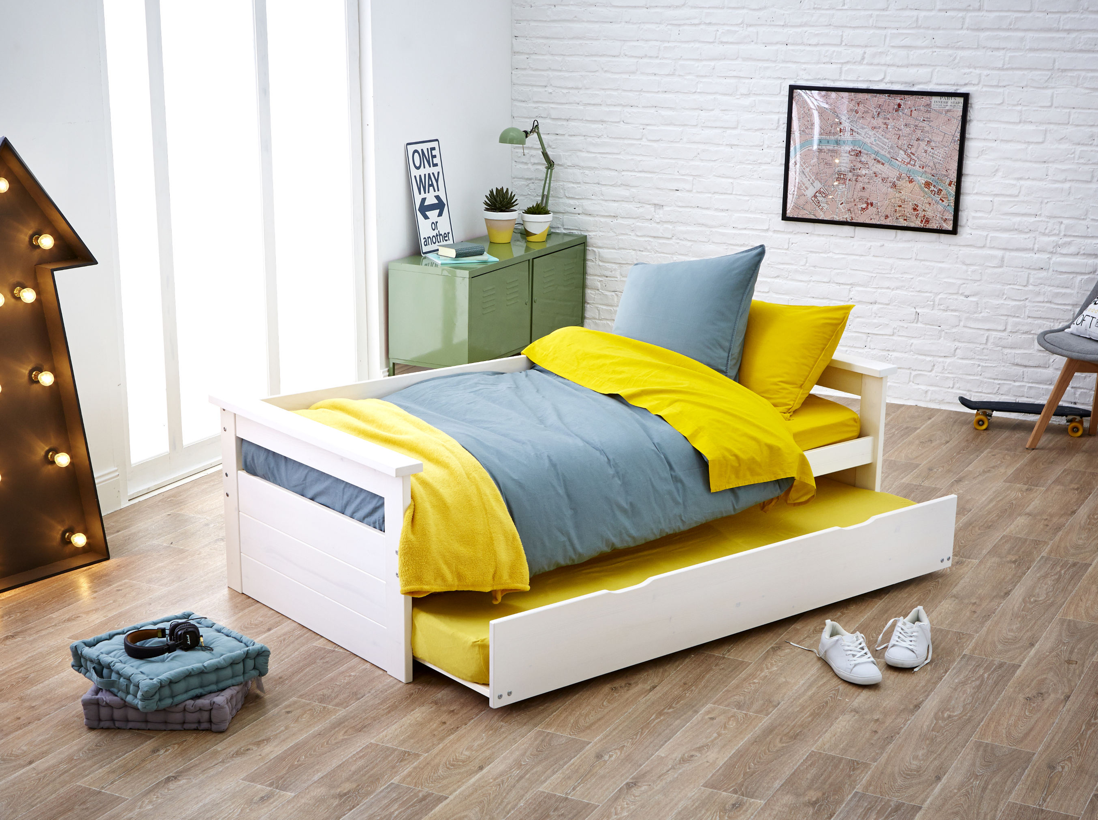 Lit banquette gigogne blanchi avec une structure en sapin massif.